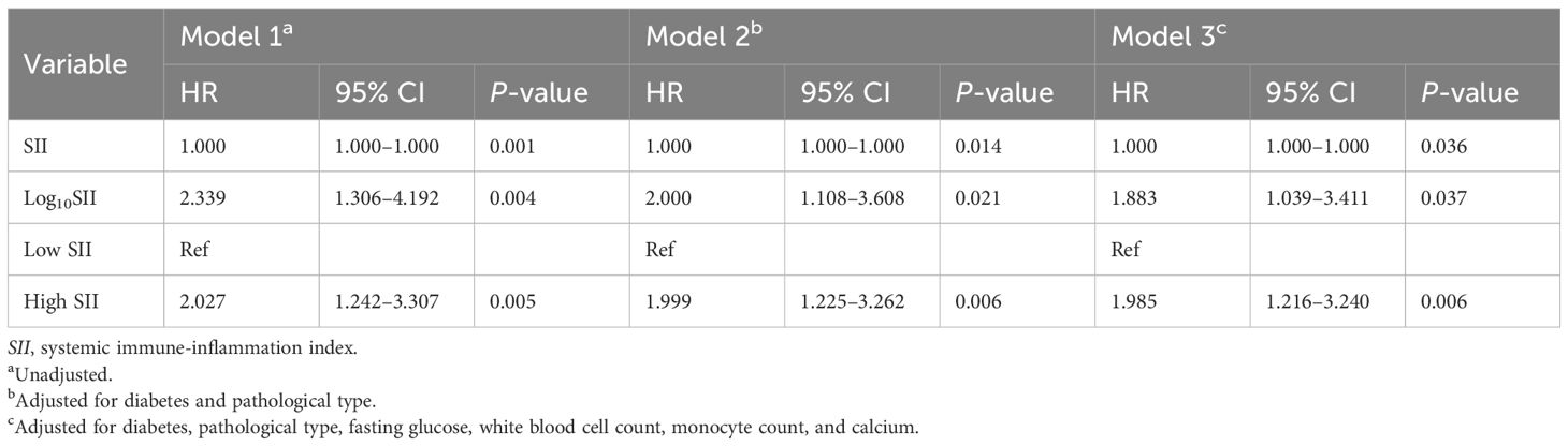 As illustrated in Table 4, SII, analyzed both as a categorical and continuous variable, was notably associated with ACM in the unadjusted model 1. Compared with the low SII group, a 2.027-fold increase in ACM risk was found in the high SII group (HR = 2.027; 95% CI = 1.242–3.307; p = 0.005). In model 2, which controlled for DM and pathological type, a 1.999-fold elevated ACM risk was observed in the high SII group (HR = 1.999; 95% CI = 1.225–3.262; p = 0.006) in contrast to the low SII group. Furthermore, a higher SII remained correlated with an elevated ACM risk in model 3, which controlled for DM, pathological type, FBG, WBC, neutrophil count, and SC. In this model, in contrast to the low SII group, a 1.985-fold greater ACM risk was found in the high SII group (HR = 1.985; 95% CI = 1.216–3.240; p = 0.006). These findings suggested that SII may act as an independent biomarker for assessing unfavorable prognosis.