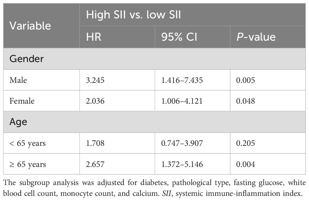 As illustrated in Table 5, multivariate Cox analysis suggested that an elevated SII was associated with a higher ACM risk among both women and men. The association was more pronounced in the male subgroup (HR = 3.245; 95% CI = 1.416–7.435; p = 0.005). Compared with the low SII group, the ACM risk in the high SII group was 2.036 times higher in the female subgroup (HR = 2.036; 95% CI = 1.006–4.121; p = 0.048). In the age subgroup, a high SII was notably associated with an elevated ACM risk among older patients aged above 65 (HR = 2.675; 95% CI = 1.372–5.146; p = 0.004), indicating that SII may be a stronger indicator for predicting mortality risk in older populations.