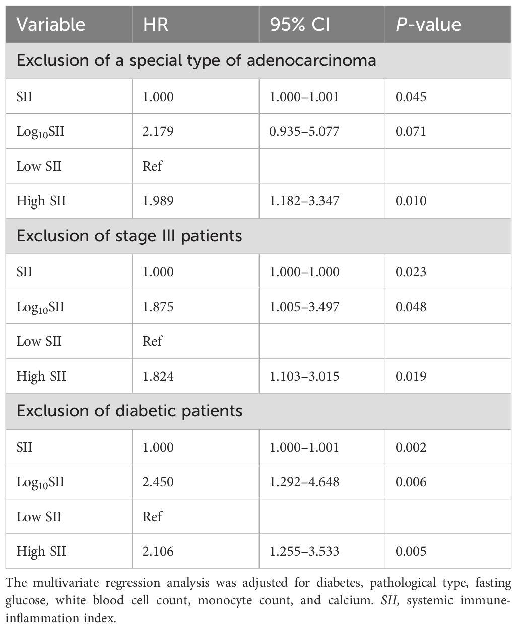 As illustrated in Table 6, after excluding individuals with special types of ADC, a higher SII was still associated with an elevated ACM risk. Compared with the low SII group, a 1.989-fold increase in ACM risk was observed in the high SII group (HR = 1.989; 95% CI = 1.182–3.347; p = 0.010). After excluding stage III LC patients, SII—whether analyzed as a categorical or continuous variable—remained notably associated with ACM, with the high SII group having a 1.824-fold increased ACM risk (95% CI = 1.103–3.015; p = 0.019) compared with the low SII group. After excluding diabetic patients, a higher SII was notably linked to an elevated ACM risk, with the high SII group having a 2.106-fold greater ACM risk (95% CI = 1.255–3.533; p = 0.005) compared with the low SII group. These sensitivity analyses indicated that the association between SII and ACM remained significant after excluding individuals with specific types of ADC, stage III disease, or DM. These results confirm the robustness of SII as an independent indicator for predicting ACM.