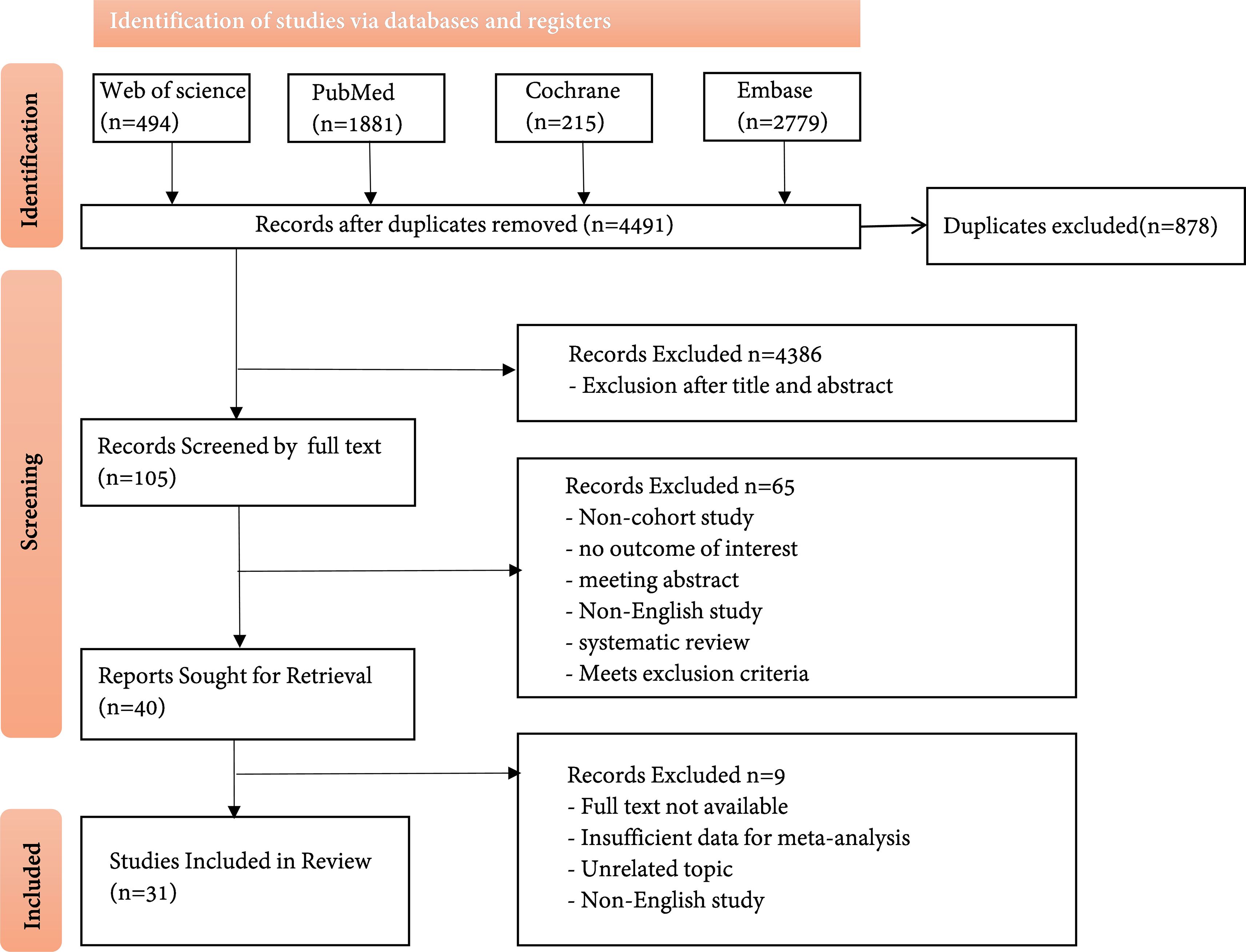 Through the search method described above, a total of 5,369 articles were retrieved. After removing 891 duplicate articles, 4,386 articles that did not match the research topic were excluded after a preliminary review of titles and abstracts, resulting in 105 articles after initial screening. Subsequently, 65 articles were excluded after a detailed full-text review, including non-cohort studies, studies involving non-type 2 diabetes patients, studies without relevant results, conference abstracts, non-English studies, and systematic reviews, leaving 40 articles. Finally, articles that could not be downloaded and had incomplete data were excluded, resulting in 31 articles. The search process is shown in Figure 1.