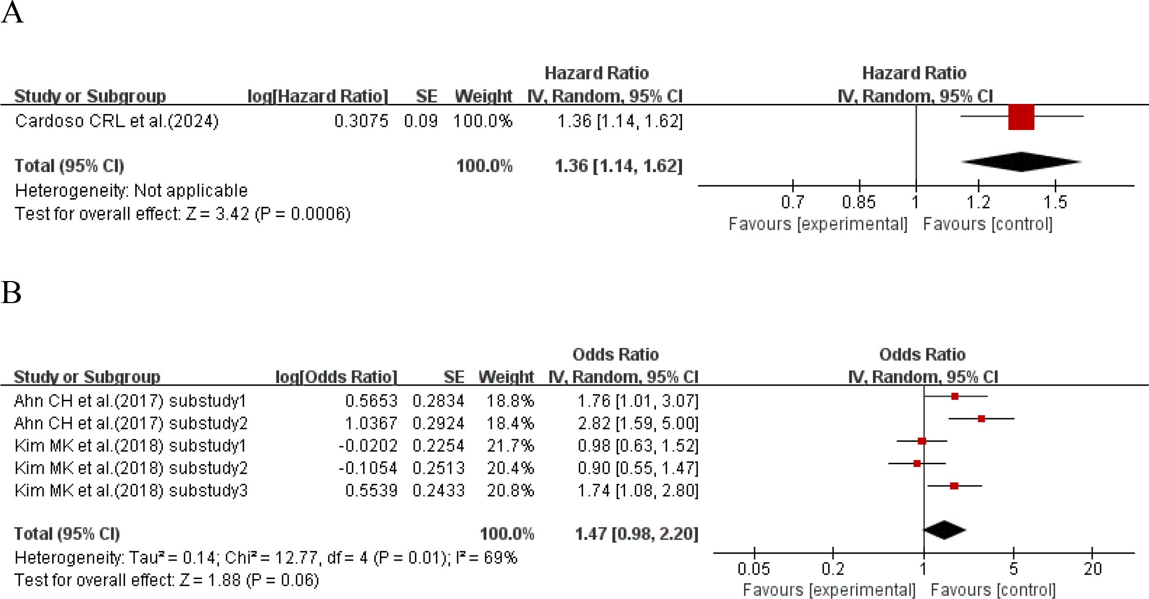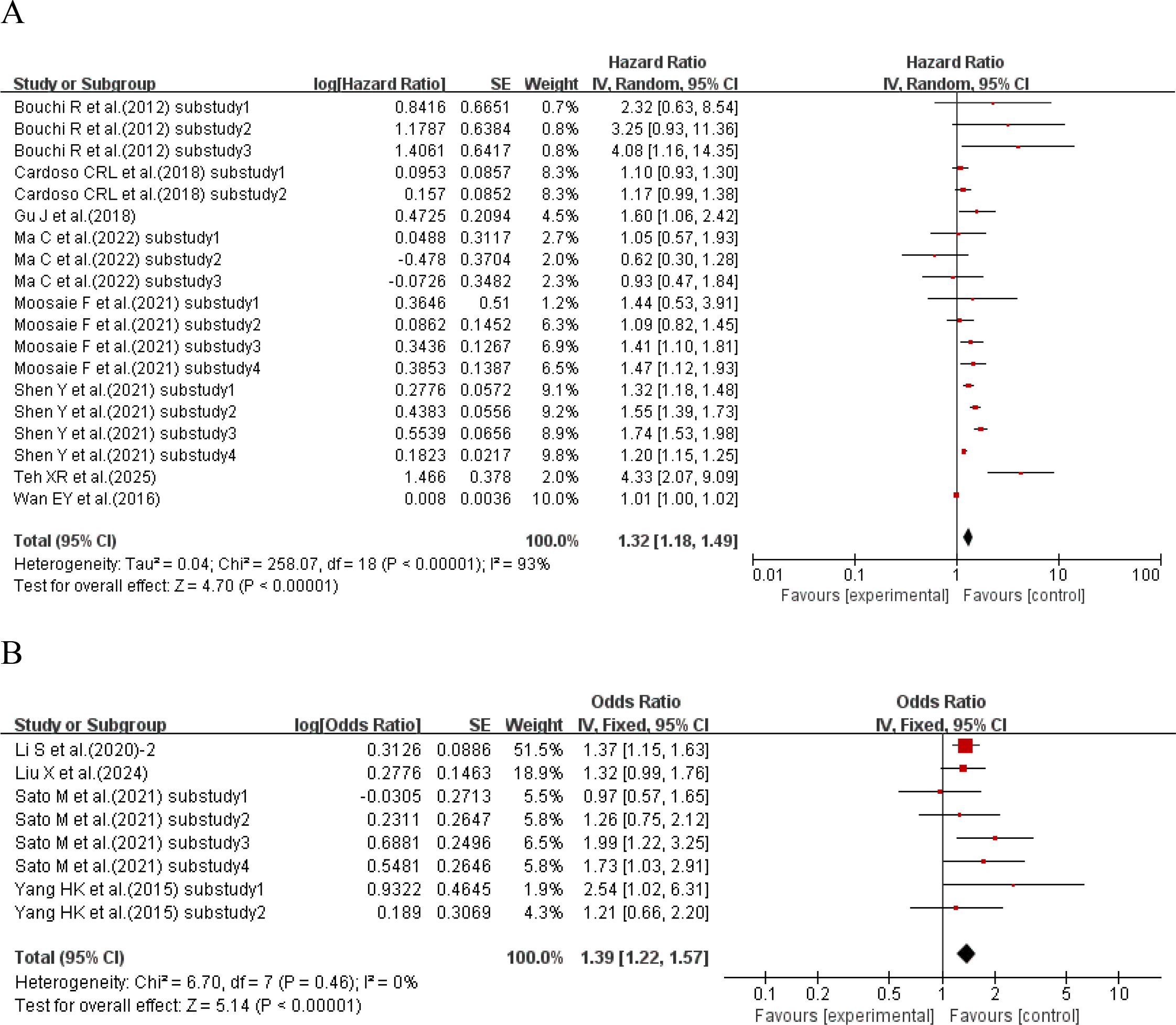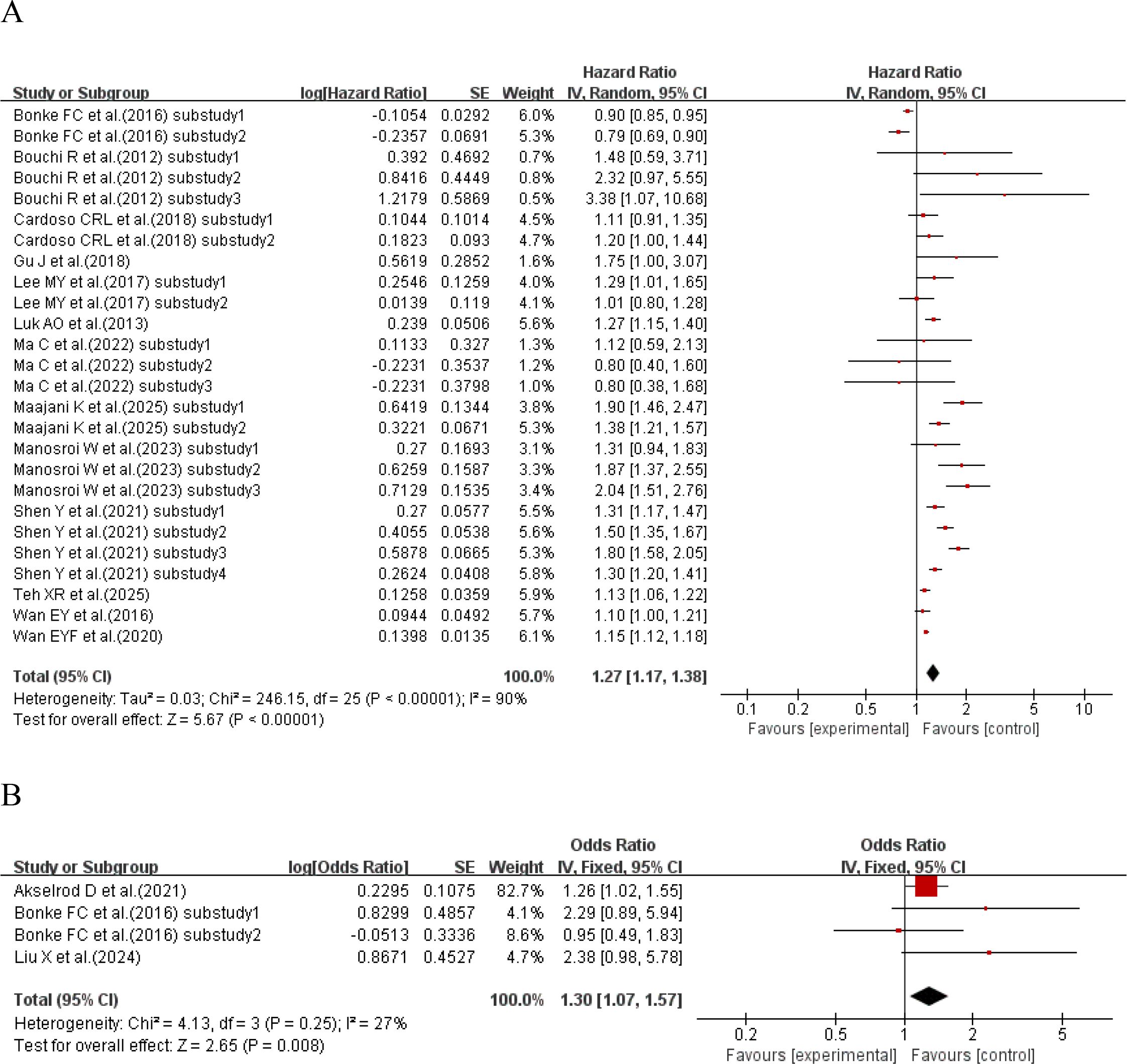Figure 4. Forest plot showing the association between HbA1c variability (HbA1c-HGI) and cardiovascular disease incidence in patients with T2DM, including (A) Hazard Ratio (HR) and (B) Odds Ratio (OR).