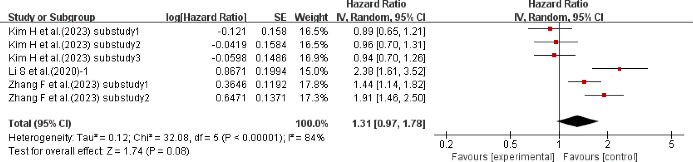 When the effect size was HR, one study (16) explored the relationship between HbA1c-HGI and the incidence of cardiovascular disease. The results showed that compared with type 2 diabetes patients with lower HbA1c-HGI, the incidence of cardiovascular disease in type 2 diabetes patients with higher HbA1c-HGI increased by 36% (HR = 1.36, 95%CI 1.14-1.62, P = 0.0006). When the effect size was OR, 2 studies (17, 34) with a total of 5 sub-studies explored the relationship between HbA1c-HGI and the incidence of cardiovascular disease. There was heterogeneity among the studies (I²=69%, P = 0.01), so a random-effects model was used for analysis. The results showed a positive trend that higher HbA1c-HGI might increase the risk of cardiovascular disease (P = 0.06 > 0.05), with no statistically significant difference, as shown in Figure 4.