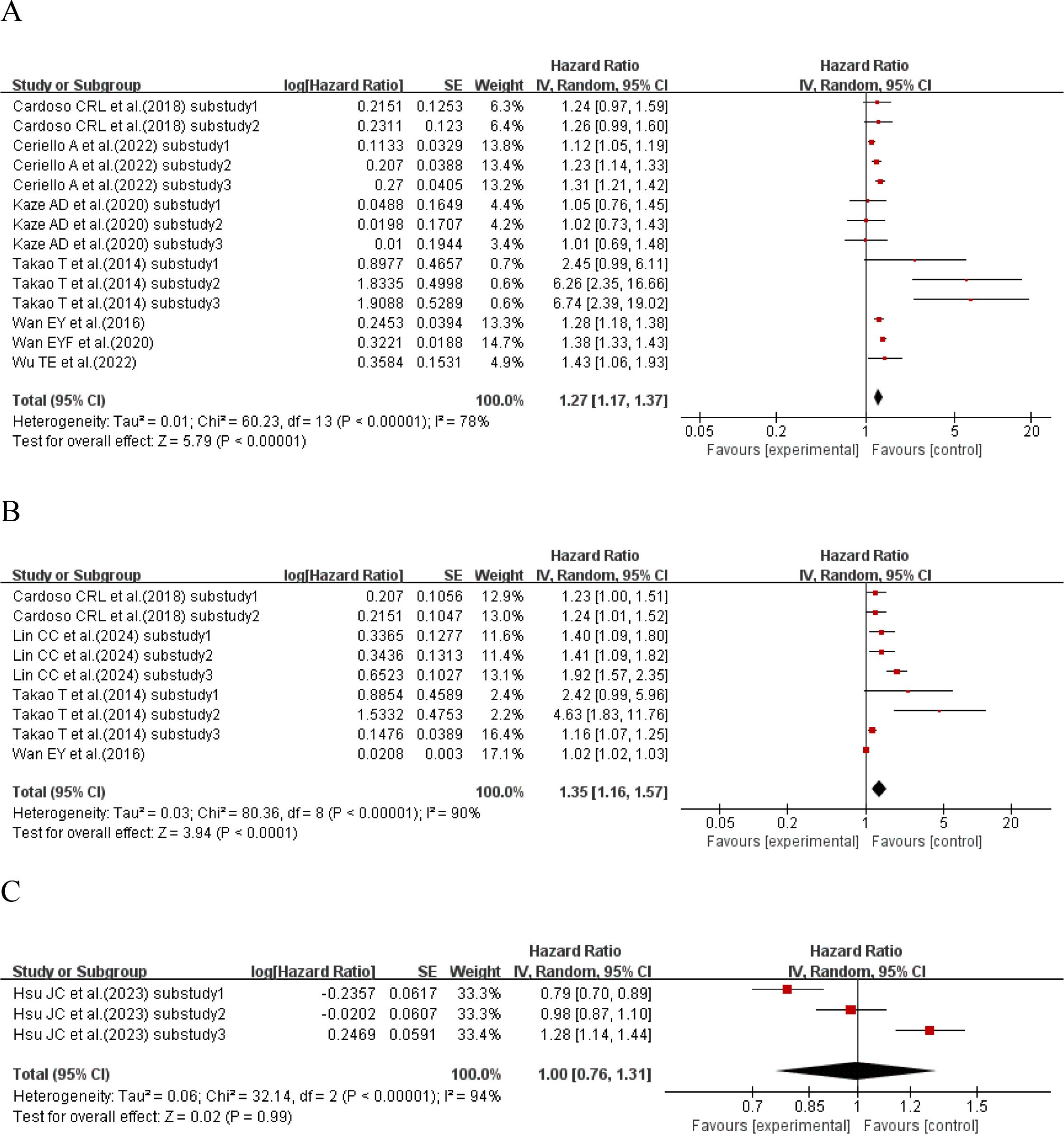 Figure 6. Forest plot of cardiovascular mortality in patients with type 2 diabetes mellitus from published reports, presenting Hazard Ratios (HRs) for (A) HbA1c-SD, (B) HbA1c-CV, and (C) HbA1c-HVS.
