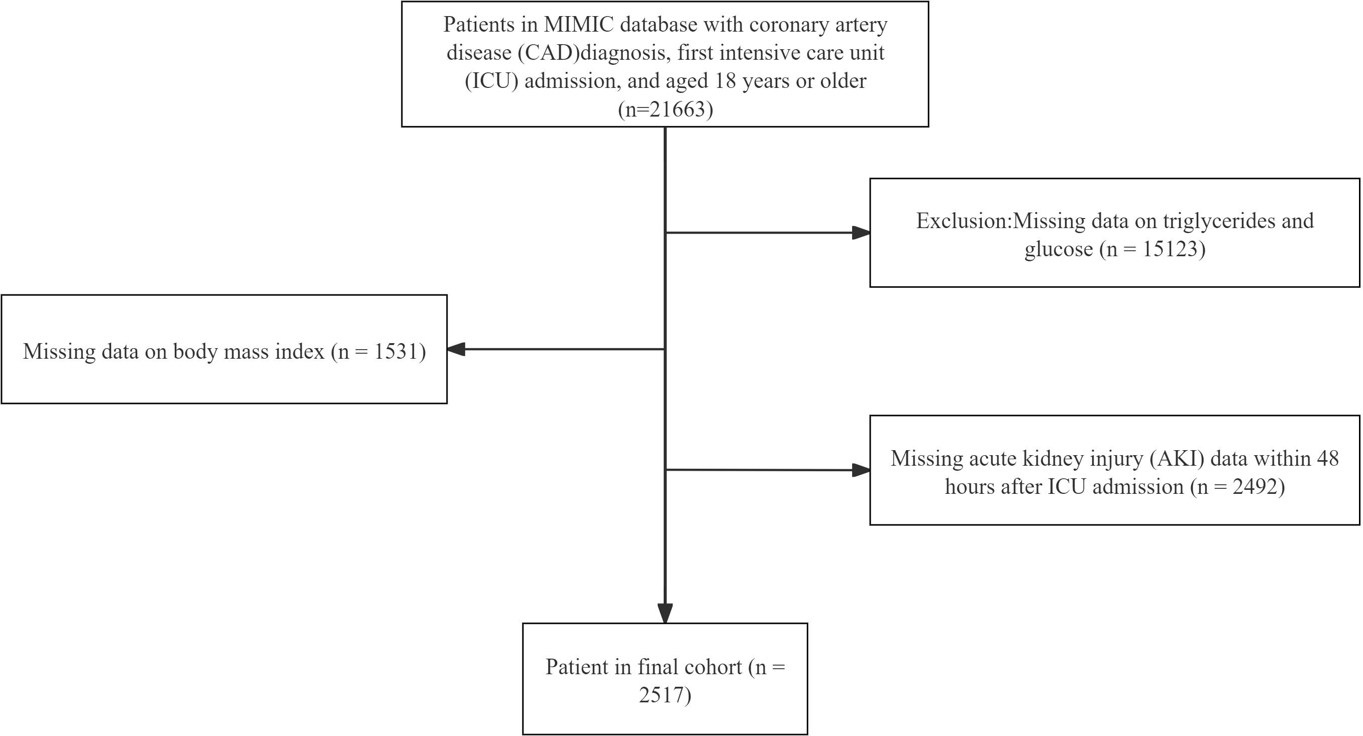 The study population from MIMIC-IV comprised 21,663 patients diagnosed with CAD who were admitted to the intensive care unit (ICU) for the first time (≥18 years). The exclusion criteria were: (1) missing triglyceride or glucose data, (2) missing body mass index (BMI) data, and (3) missing AKI-related data within 48 hours of ICU admission. After applying these criteria, 2,517 patients were included in the study. (Figure 1) Data from our center were retrospectively collected using the same inclusion and exclusion criteria, comprising 910 patients diagnosed with CAD and admitted to the ICU at Union Hospital, Tongji Medical College, Huazhong University of Science and Technology, between November 2021 and June 2024, serving as an external validation cohort.