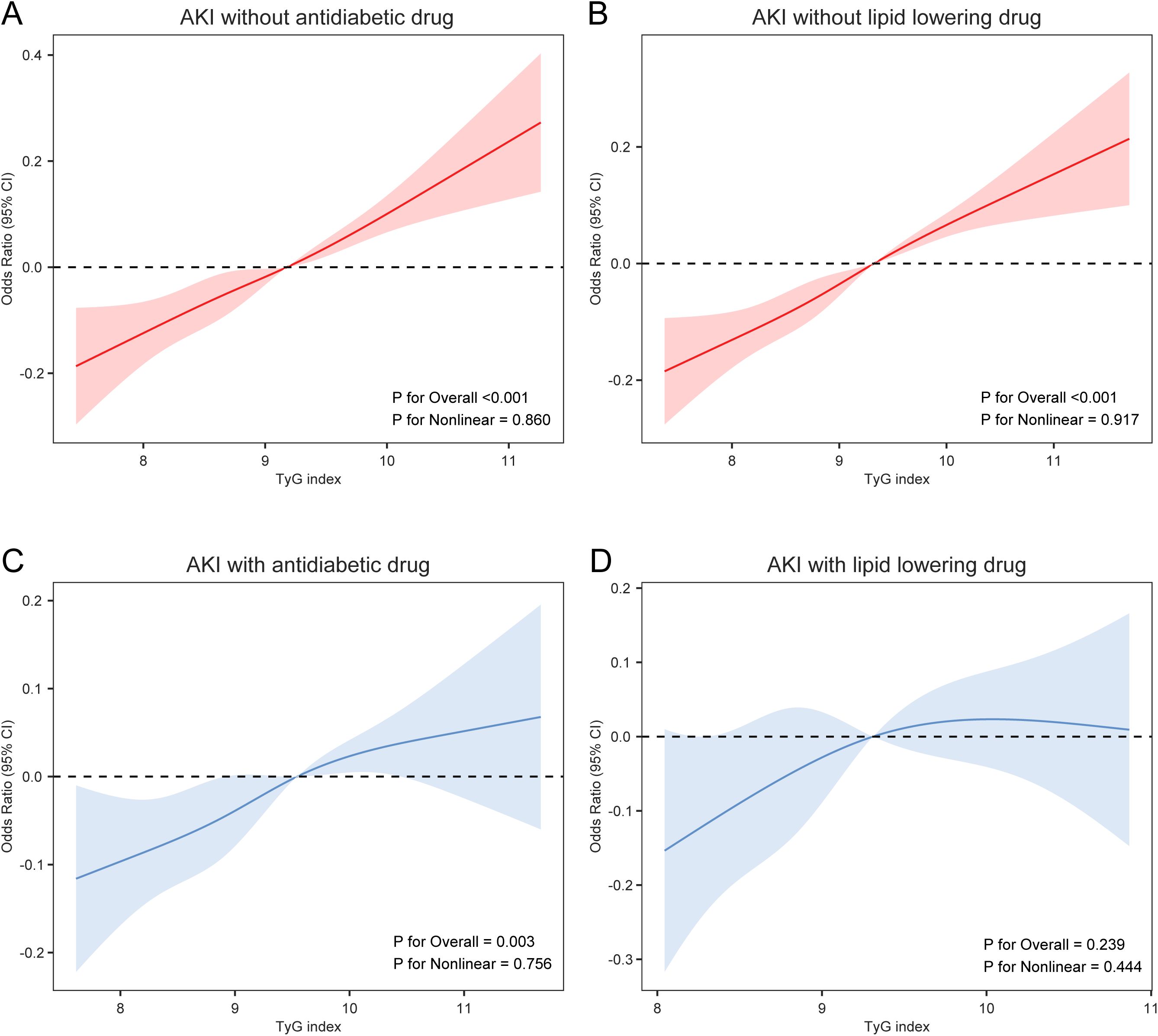 Figure 2. Association of the TyG Index with AKI, stratified by antidiabetic and lipid-lowering drug use. (A) Restricted cubic spline curve for the AKI without antidiabetic drug; (B) Restricted cubic spline curve for the AKI without lipid lowering drug; (C) Restricted cubic spline curve for the AKI with antidiabetic drug; (D) Restricted cubic spline curve for the AKI with lipid lowering drug. The non-medication group was indicated in red, while the medication group was indicated in blue, shaded areas indicate 95% CIs. AKI, acute kidney injury; TyG index, triglyceride-glucose index.