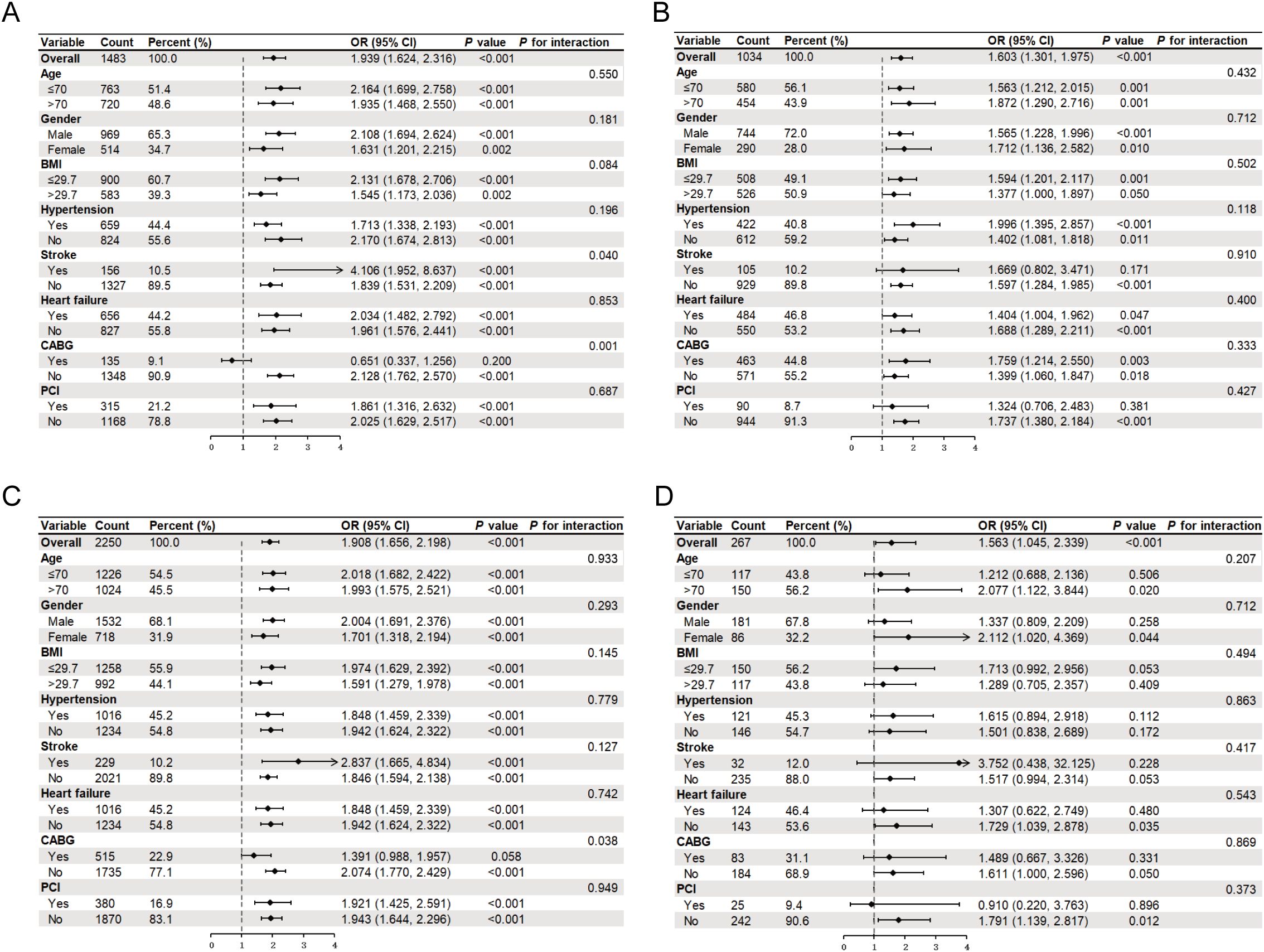 Figure 3. Subgroup analysis forest plot stratified by antidiabetic or lipid-lowering drug use. (A) Without antidiabetic drug; (B) With antidiabetic drug; (C) Without lipid lowering drug; (D) With lipid lowering drug. BMI, body mass index; OR, odds ratio; CI, confidence interval.