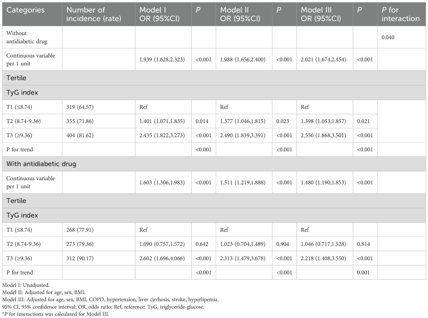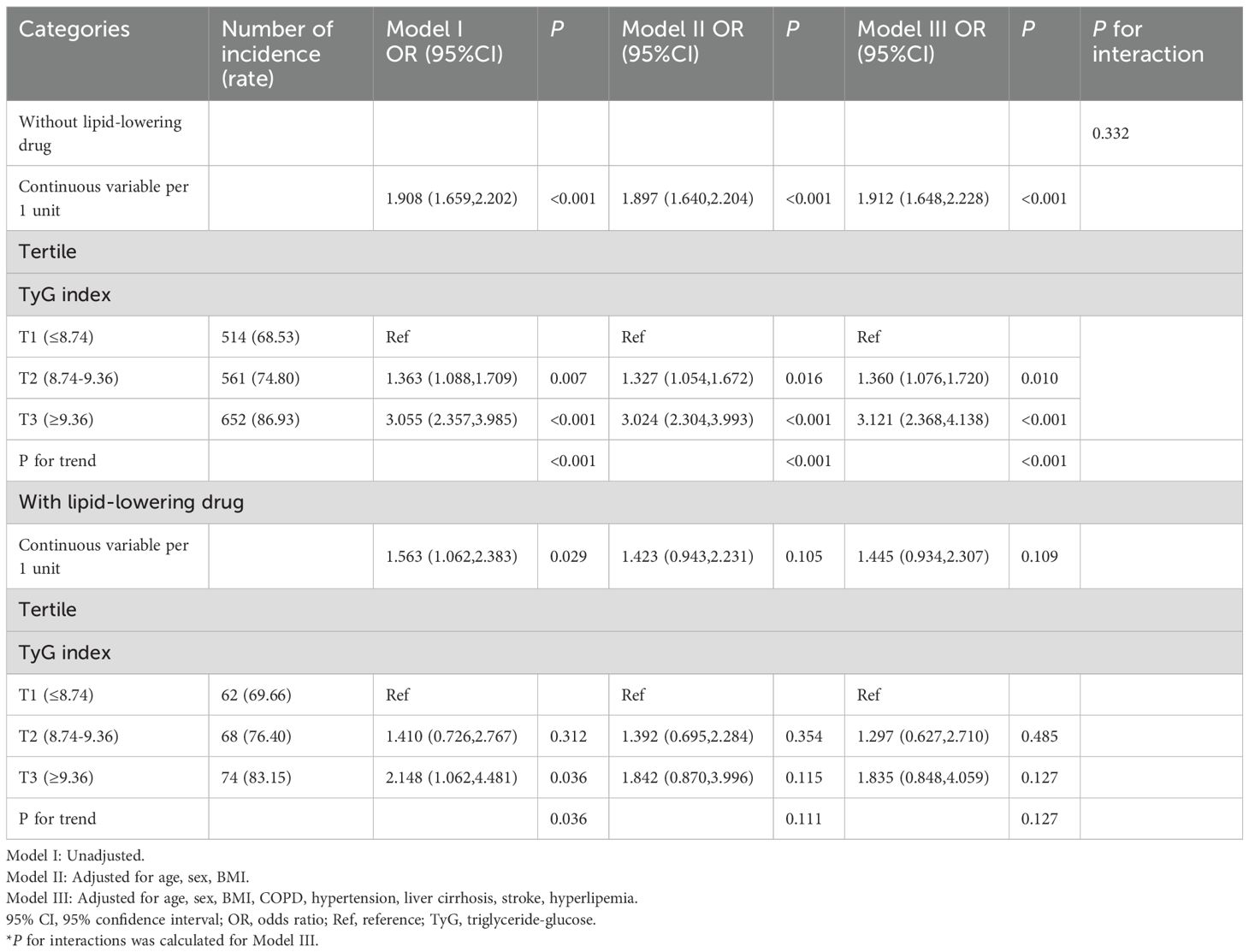 To further verify the robustness of the results, a sensitivity analysis was performed by including individuals excluded from the MIMIC-IV database due to missing BMI data, using logistic regression. The TyG index was reclassified into tertiles: T1 (≤ 8.70), T2 (8.70–9.30), and T3 (≥ 9.30). The main findings regarding antidiabetic and lipid-lowering drug use were consistent with the previous analyses. Significant interactions were observed between TyG index and antidiabetic drug use (P for interaction = 0.004) as well as lipid-lowering drug use (P for interaction = 0.008) (Supplementary Tables S9, S10).
