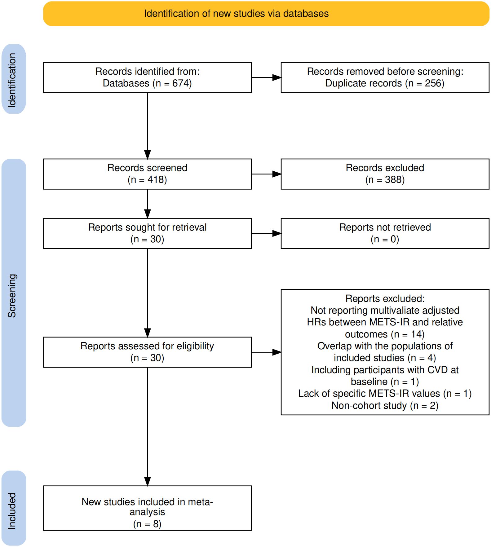 This study completed literature screening in accordance with the PRISMA statement (Figure 1). A total of 674 relevant studies were retrieved from databases (PubMed, EMBASE, The Cochrane Library, Web of Science). After removing 256 duplicate records, the remaining 418 studies underwent title and abstract screening, and 388 studies that did not meet the criteria were excluded. Through full-text assessment, additional studies were excluded for the following reasons: failure to report multivariable-adjusted HR (n=14), population overlap (n=4), inclusion of participants with baseline cardiovascular disease (CVD) (n=1), lack of specific METS-IR values (n=1), and being non-cohort studies (n=2). Finally, 8 cohort studies were included in the meta-analysis (27–34).