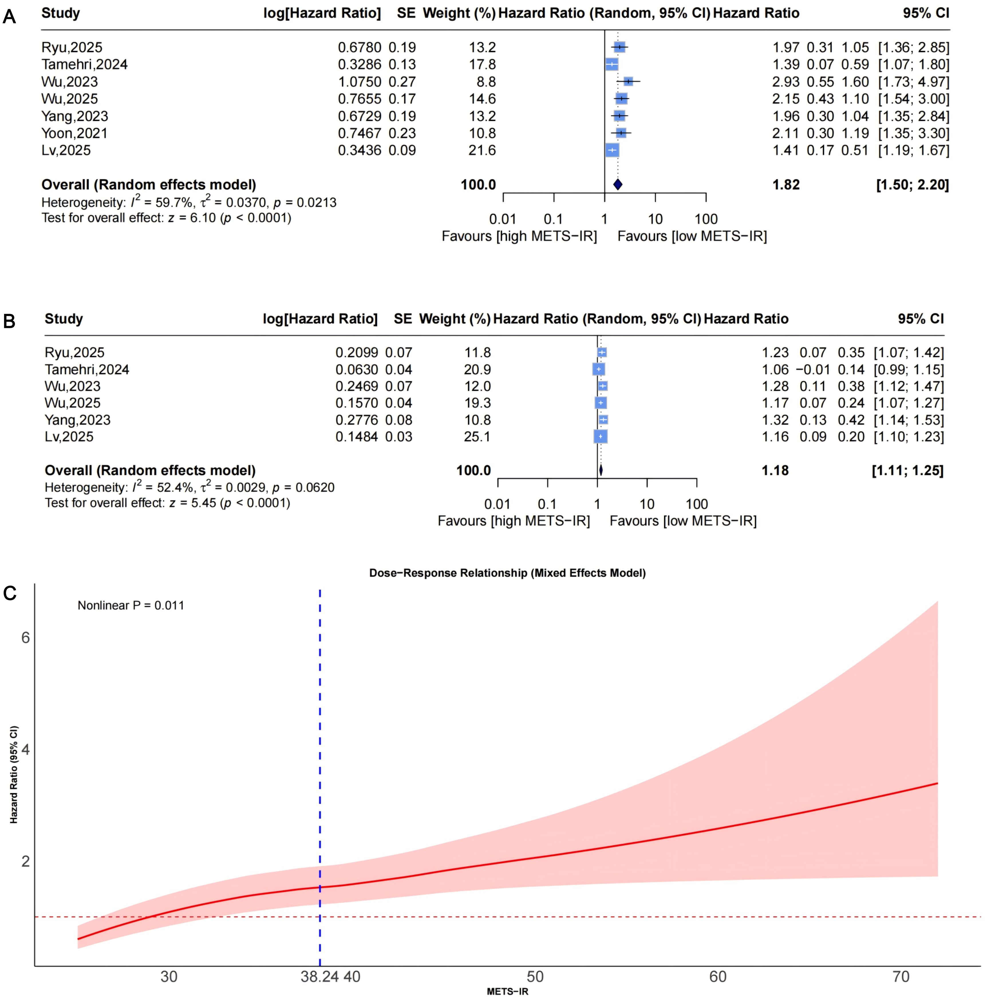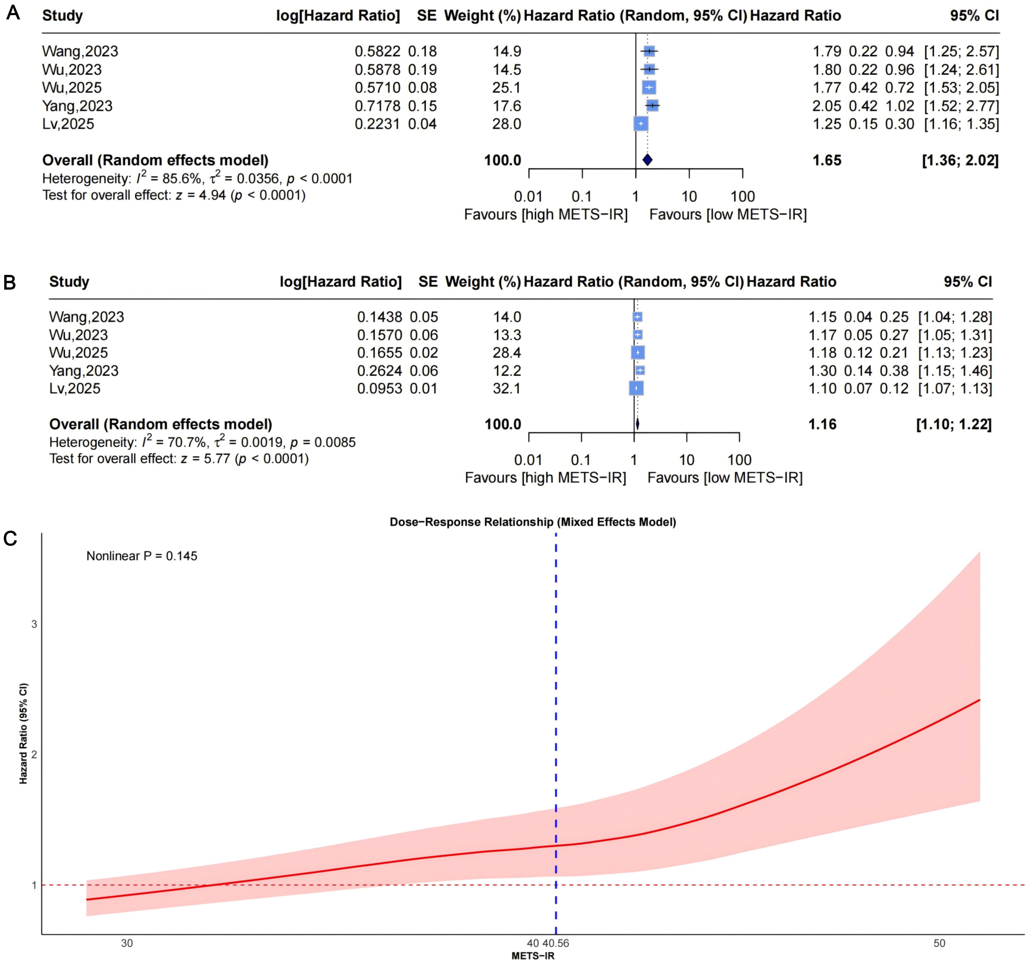 Figure 2. Forest plots (A, B) and nonlinear dose-response curve (C) for the association between METS-IR and CVD risk, analyzed as a categorical variable (highest vs. lowest; A) and continuous variable (per 1-SD increment; (B). In forest plots, the diamond represents the pooled effect estimate; colored squares indicate study weights, and black horizontal lines denote 95% CIs of individual study effect sizes. The dose-response curve was fitted using restricted cubic spline regression; the red line shows the pooled association, with the red shaded area representing 95% CIs. The blue dashed line marks the key inflection point (METS-IR = 40.56). METS-IR, metabolic score for insulin resistance; CVD, cardiovascular disease; CI, confidence interval; SD, standard deviation.