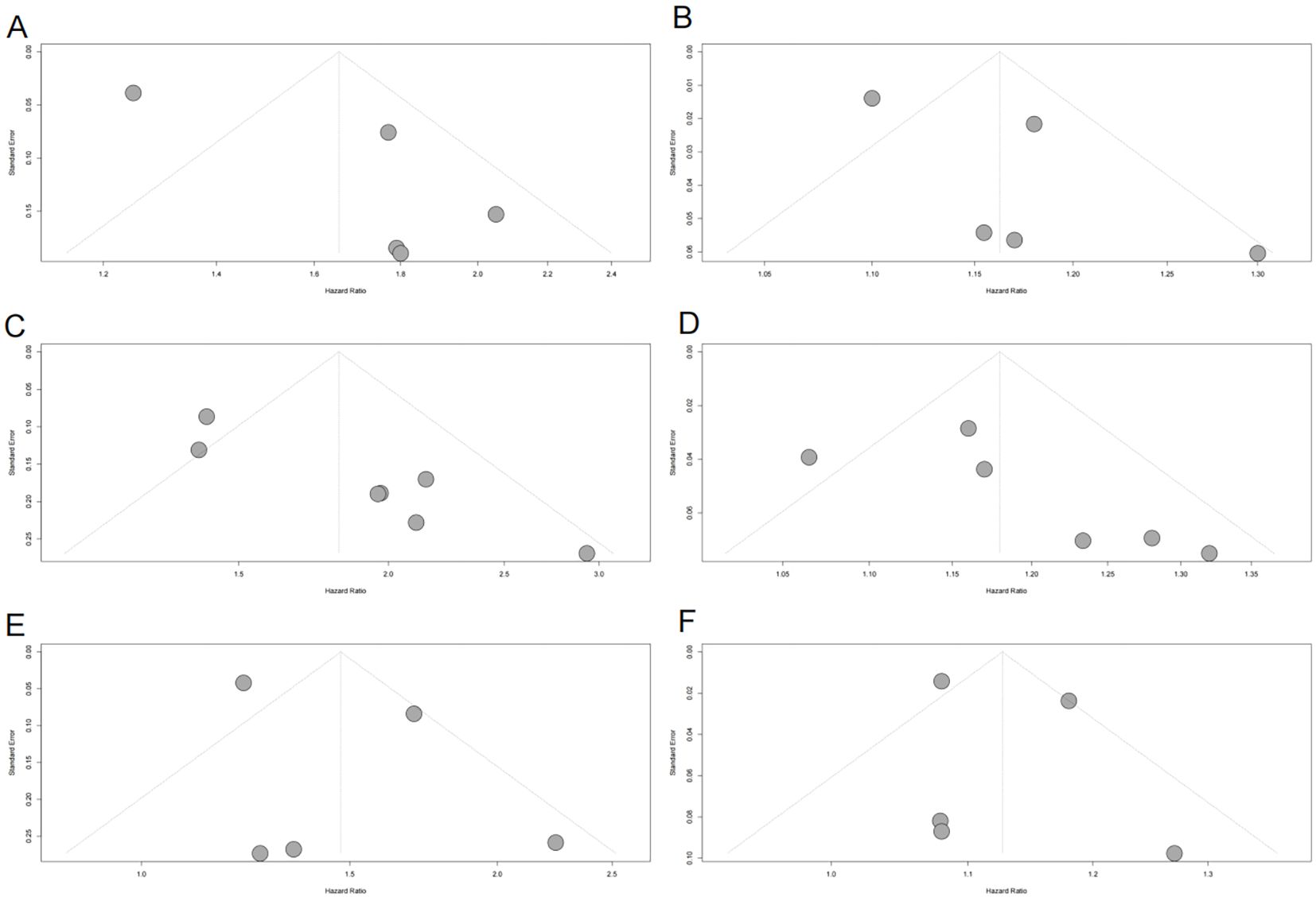 Figure 3. Funnel plots assessing publication bias in the meta-analysis of the association between METS-IR and CVD, CAD, and stroke risks. (A) METS-IR as a categorical variable and CVD risk; (B) METS-IR as a continuous variable and CVD risk; (C) METS-IR as a categorical variable and CAD risk; (D) METS-IR as a continuous variable and CAD risk; (E) METS-IR as a categorical variable and stroke risk; (F) METS-IR as a continuous variable and stroke risk. Gray dots represent individual included studies. METS-IR, metabolic score for insulin resistance; CVD, cardiovascular disease; CAD, coronary artery disease.