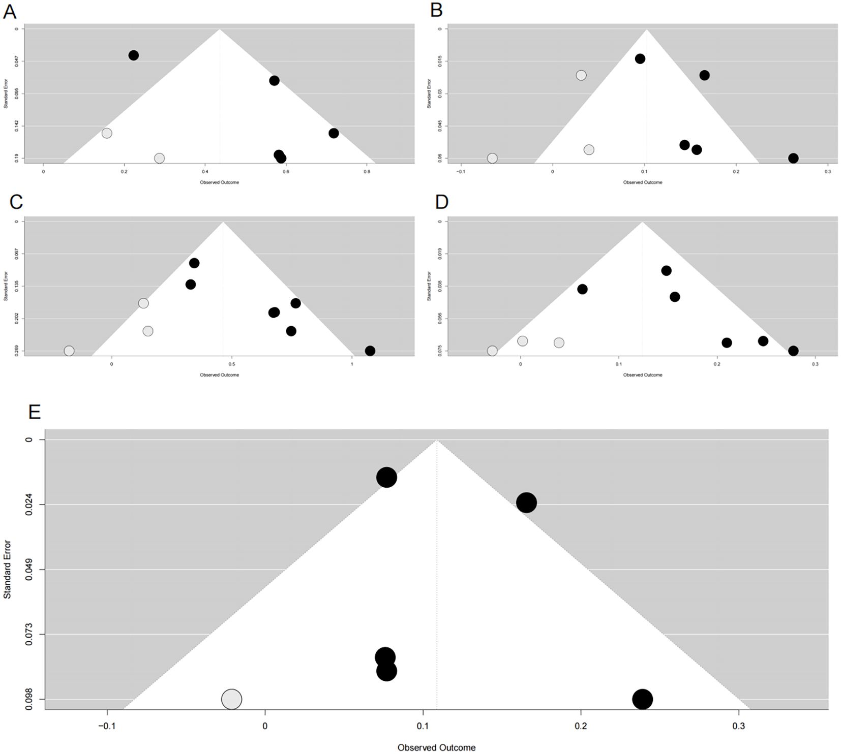 Figure 4. Funnel plots after trim-and-fill adjustment for publication bias in associations between METS-IR and cardiovascular risks. (A) METS-IR as a categorical variable vs. CVD risk; (B) METS-IR as a continuous variable vs. CVD risk; (C) METS-IR as a categorical variable vs. CAD risk; (D) METS-IR as a continuous variable vs. CAD risk; (E) METS-IR as a continuous variable vs. stroke risk. Black dots represent originally included studies; gray dots represent studies imputed by the trim-and-fill method. METS-IR, metabolic score for insulin resistance; CVD, cardiovascular disease; CAD, coronary artery disease.