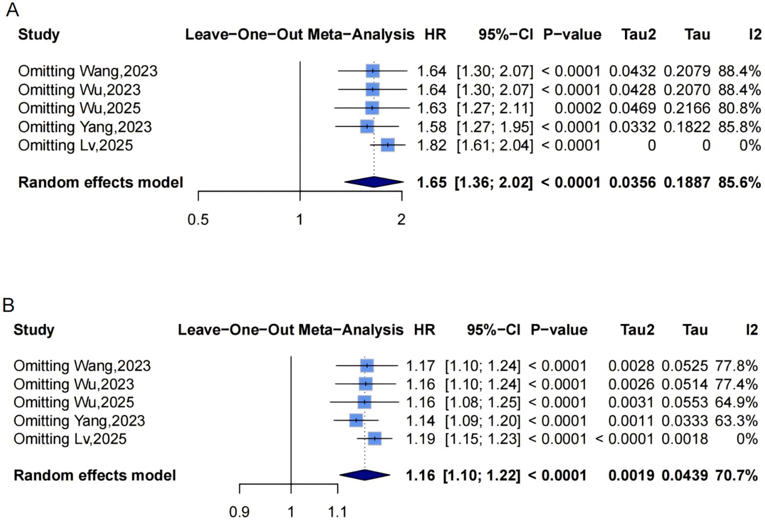 Funnel plots indicated asymmetry for both categorical (Figure 3A, trim-and-fill estimated 2 missing studies, SE = 1.6604; adjusted HR = 1.55, 95% CI: 1.28-1.86, Supplementary Material: Figure S1A, 4A) and continuous analyses (Figure 3B, 3 missing studies, SE = 1.4845; adjusted HR = 1.11, 95% CI: 1.05-1.17; Supplementary Material: Figures S1B, 4B), suggesting potential missing negative-result studies. Sensitivity analyses confirmed robust results: categorical HR ranged from 1.58-1.82; continuous HR ranged from 1.16-1.17 (all P<0.0001; Figures 5A, B). Omitting Lv,2025 (34) led to the most pronounced I² reductions (e.g., to 0% for composite CVD; Figures 5–7). Due to fewer than 10 studies, Egger’s test and subgroup analyses were not performed.