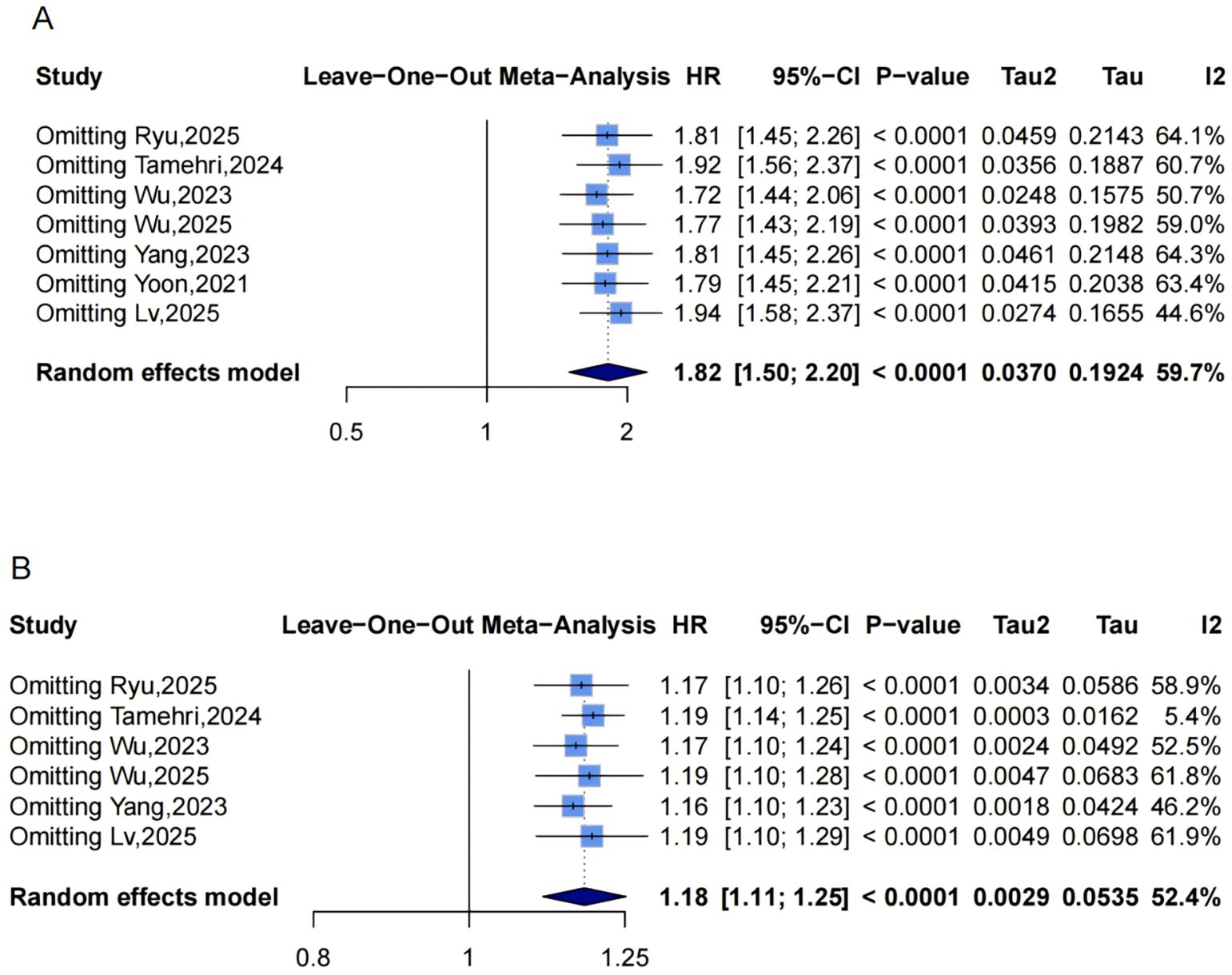 Figure 7. Leave-one-out sensitivity analyses of the meta-analysis for METS-IR and stroke risk. Blue squares denote the pooled HR for each leave-one-out scenario, with horizontal lines indicating 95% CIs. The diamond at the bottom represents the overall pooled HR from the random-effects model. (A) METS-IR as a categorical variable; (B) METS-IR as a continuous variable. METS-IR, metabolic score for insulin resistance; HR, hazard ratio; CI, confidence interval.