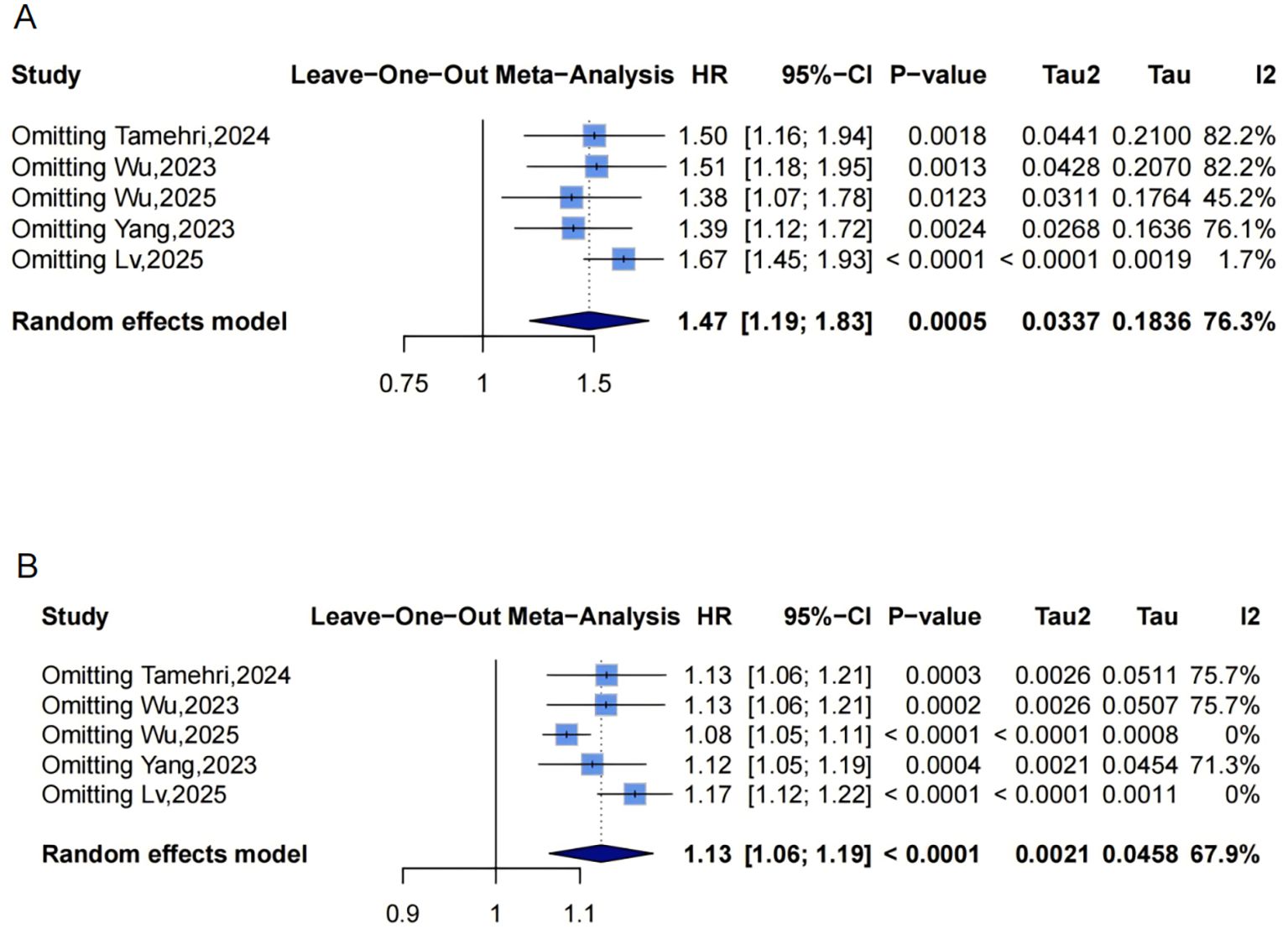 Figure 5. Leave-one-out sensitivity analyses of the meta-analysis for METS-IR and CVD risk. Blue squares denote the pooled HR for each leave-one-out scenario, with horizontal lines indicating 95% CIs. The diamond at the bottom represents the overall pooled HR from the random-effects model. (A) METS-IR as a categorical variable; (B) METS-IR as a continuous variable. METS-IR, metabolic score for insulin resistance; CVD, cardiovascular disease; HR, hazard ratio; CI, confidence interval.