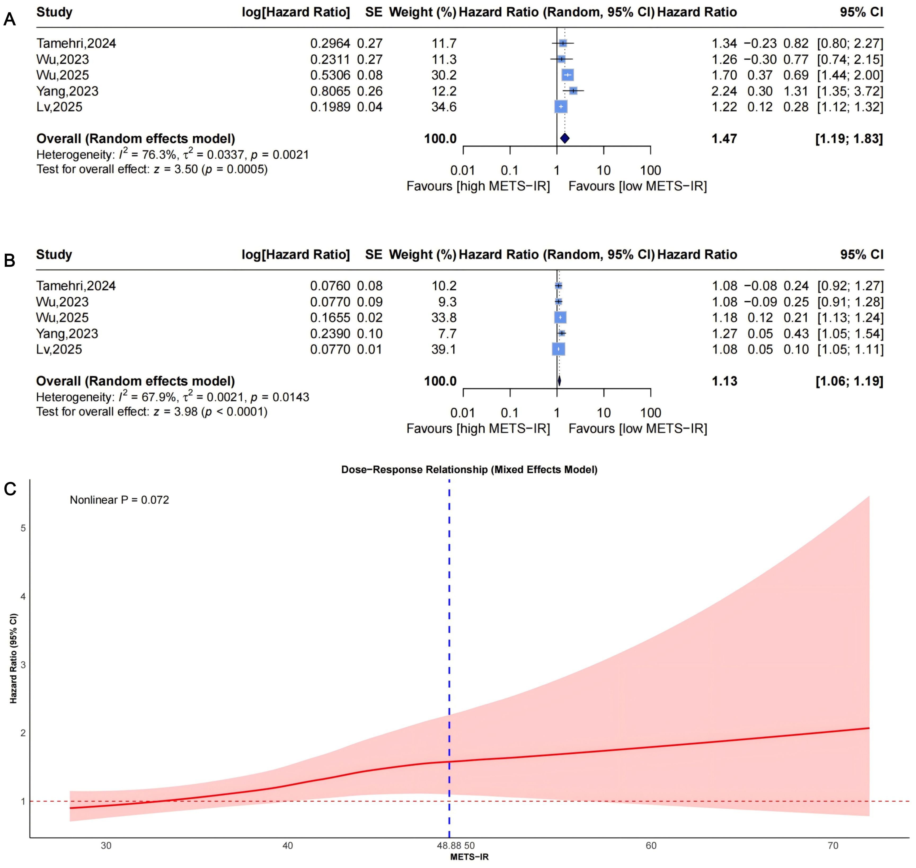 Pooled from 5 studies (Figure 9A) indicated that the highest METS-IR increased stroke risk (HR = 1.47, 95% CI: 1.19-1.83, I²=76.3%, τ²=0.0337, P = 0.0005). The continuous analysis (5 studies; per 1-SD: HR = 1.13, 95% CI: 1.06-1.19, I²=67.9%, τ²=0.0021, P<0.0001, Figure 9B) aligned with this finding.