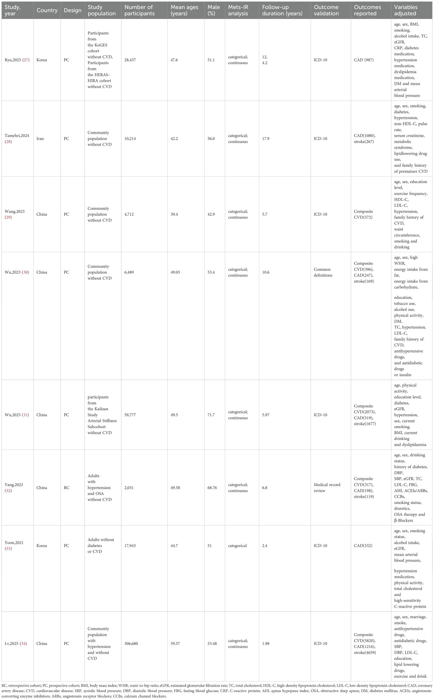The 8 included studies (27–34) were published between 2021 and 2025 (Table 1), consisting of 7 prospective cohort studies (PC) (27–31, 33, 34) and 1 retrospective cohort study (RC) (32), originating from China (5 studies) (29–32, 34), South Korea (2 studies) (27, 33), and Iran (1 study) (28). The total sample size was 437,283 participants, with individual study sizes ranging from 2,031 to 306,680. All participants had no CVD at baseline (among them, Lv,2025 (34) included hypertensive participants without baseline CVD; Yang,2023 (32) included hypertensive participants with obstructive sleep apnea but without CVD; Yoon,2021 (33) included participants without diabetes or CVD). The mean age ranged from 39.4 to 59.57 years, and the male proportion was 42.9% to 71.7% (highest in Wu,2025 (31); lowest in Wang,2023 (29). Follow-up durations ranged from 1.98 to 17.9 years (shortest in Lv,2025 (34); longest in Tamehri,2024 (28). Primary outcomes included composite CVD, CAD, and stroke. Specifically, there were 317 to 5,820 composite CVD events (5 studies (29–32, 34); total 9,178 events), 198 to 1,216 CAD events (7 studies (27, 28, 30–34); total 4,579 events), and 119 to 4,659 stroke events (5 studies (28, 30–32, 34); total 6,891 events). All studies adjusted for confounders such as age, sex, smoking, alcohol consumption, hypertension, diabetes, and lipid profiles; some also adjusted for medication use (e.g., antihypertensives, hypoglycemics), physical indicators (e.g., BMI, waist circumference), and sociodemographic factors (e.g., education, marital status).