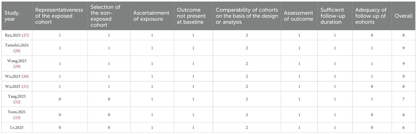 Study quality was assessed using the Newcastle-Ottawa Scale (NOS) (Table 2). The 8 studies (27–34) scored 6 to 9 points, indicating overall high quality. Evaluations focused on population selection (representativeness, exposed/unexposed groups), group comparability (confounder adjustment), and outcome ascertainment (follow-up duration, assessment methods). Tamehri,2024 (28), Wang,2023 (29), and Wu,2023 (30) scored highest (9 points); Yoon,2021 (33) and Lv,2025 (34) scored lowest (6 points), mainly due to lower representativeness of exposed/unexposed cohorts. All studies excluded baseline outcome events and adjusted for key confounders, indicating low bias risk.