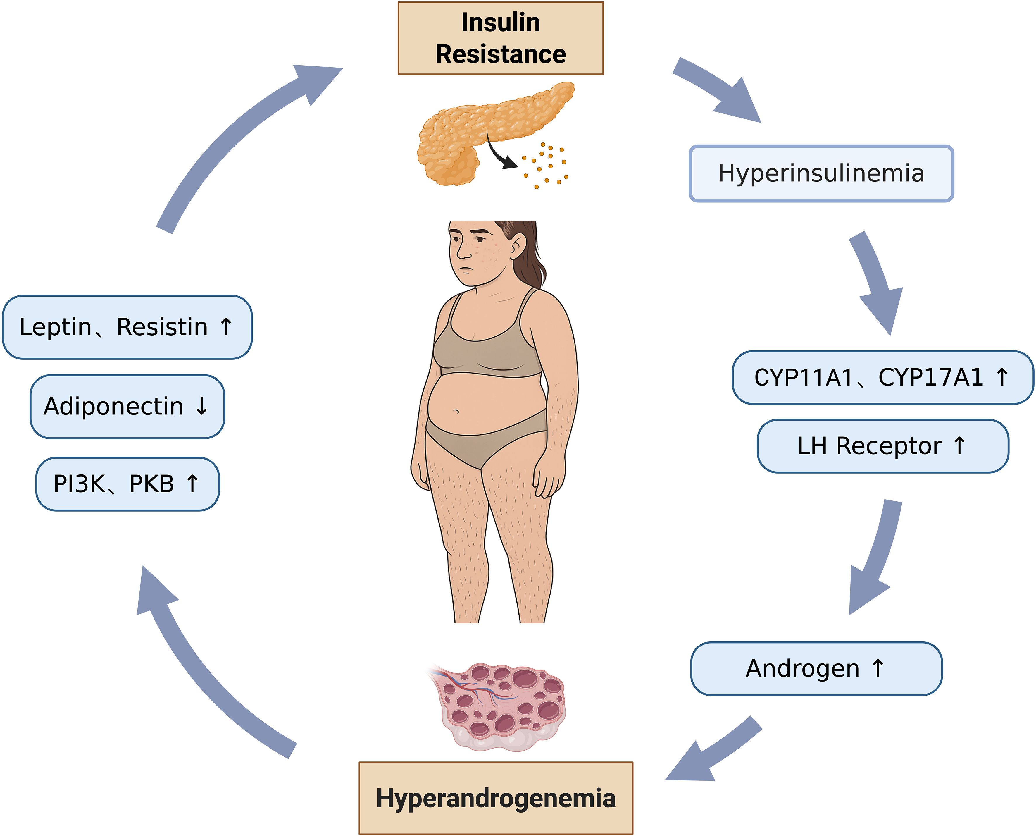 HA directly acts upon the cellular signaling pathways within insulin target organs, such as the liver, muscle, and adipose tissue, thereby inhibiting the normal physiological function of insulin. Within the insulin signaling cascade, androgens can suppress the phosphorylation and activation of key molecules, notably phosphatidylinositol 3-kinase (PI3K) and PKB. These molecules are central to insulin’s role in promoting glucose transport, glycogen synthesis, and lipogenesis. This blockage of signal transduction directly impedes the cell’s ability to effectively uptake and utilize glucose, consequently leading to IR (111, 112). In addition, HA can lower the levels of adiponectin, an insulin sensitivity-related adipokine and an important insulin sensitizer, whose reduction directly weakens the body’s responsiveness to insulin. Conversely, HA increases the release of pro-inflammatory adipokines, such as Leptin and Resistin. These factors not only exacerbate local chronic inflammation within adipose tissue but also act via systemic circulation on peripheral tissues, including the liver and skeletal muscle, further inhibiting the insulin signaling pathway and aggravating IR (113, 114). Adipocytes in PCOS patients are significantly larger than those in BMI-matched healthy women, and adipocyte size exhibits a positive correlation with the level of HA (115). These hypertrophied adipocytes demonstrate markedly reduced insulin sensitivity, coupled with decreased expression and content of GLUT-4. This results in impaired insulin-mediated glucose uptake capacity, directly inducing local IR within the adipose tissue (116).