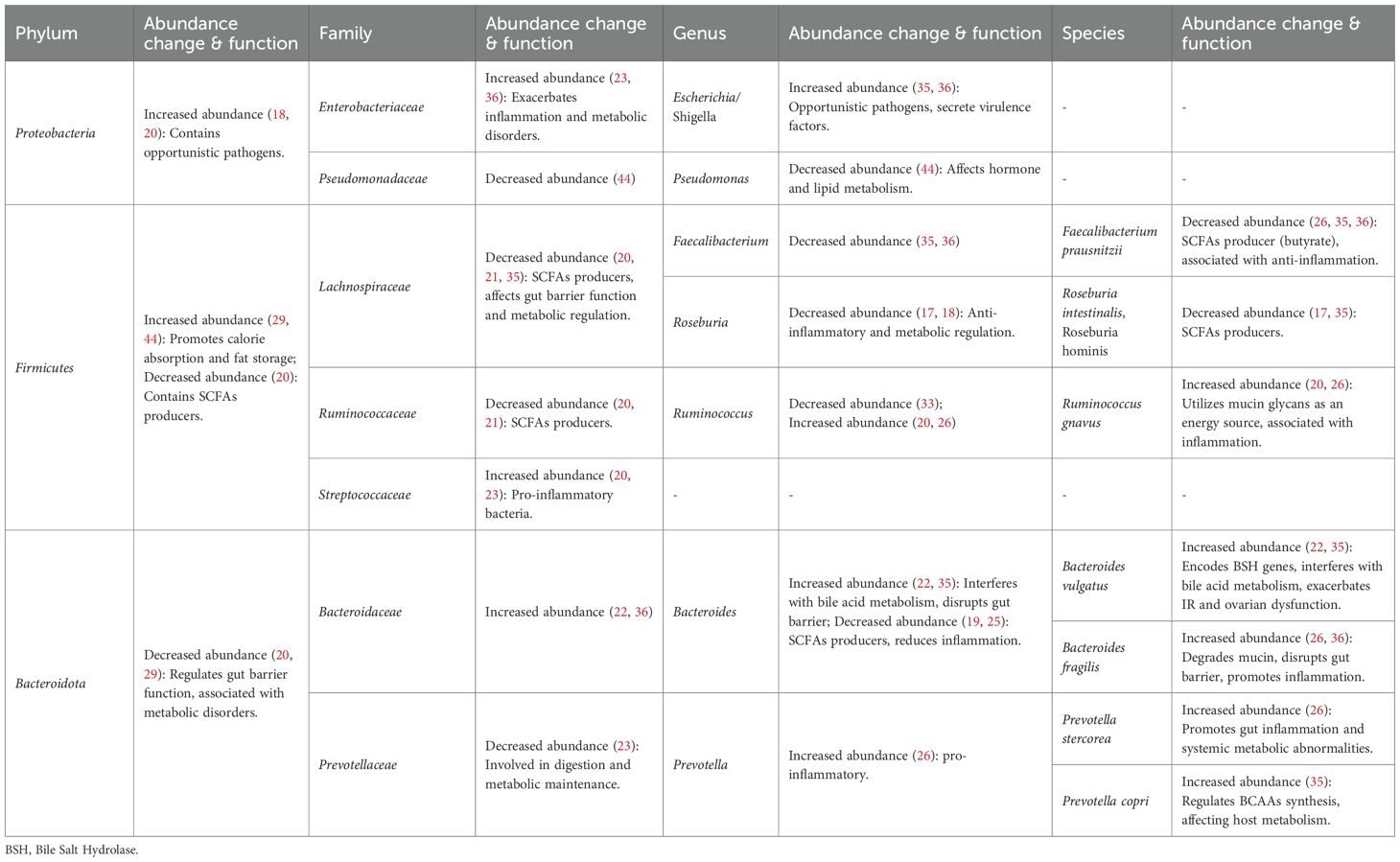 In PCOS, a significant increase in the abundance of certain potentially pathogenic and pro-inflammatory bacterial groups is observed. Specifically, the phylum Proteobacteria and its constituent family Enterobacteriaceae, particularly the genera Escherichia/Shigella, exhibit elevated abundance. These opportunistic pathogens are known to secrete virulence factors, thereby exacerbating systemic inflammation and metabolic dysfunction (18, 35, 36). Furthermore, within the phylum Bacteroidota, the family Bacteroidaceae, especially species like Bacteroides vulgatus and Bacteroides fragilis, show increased abundance. These specific bacteria contribute to the exacerbation of IR, ovarian dysfunction, and systemic inflammation through mechanisms such as interfering with bile acids (BAs) metabolism, compromising the intestinal mucosal barrier, and degrading mucin (22, 36). Similarly, species within the genus Prevotella, including Prevotella stercorea and Prevotella copri, also demonstrate increased abundance. They are implicated in promoting intestinal inflammation, leading to systemic metabolic abnormalities, and influencing branched-chain amino acids (BCAAs) synthesis and host metabolism (26, 35, 40). Concurrently, there is a general reduction in the abundance of beneficial bacteria crucial for gut health and short chain fatty acids (SCFAs)-producing bacteria. The overall abundance of the phylum Bacteroidota is generally diminished, which may impair its role in regulating intestinal barrier function and maintaining metabolic health (20, 29). Within the phylum Firmicutes, important SCFAs-producing bacterial families, such as Lachnospiraceae and Ruminococcaceae, show significantly decreased abundance. This reduction leads to diminished production of SCFAs like butyrate, consequently weakening intestinal barrier function, anti-inflammatory effects, and metabolic regulatory capacity (20, 21, 35). Firmicutes and Bacteroidota are the two most dominant phyla in the human gut microbiota, and their relative abundance ratio (F/B ratio) is considered a critical indicator for assessing gut dysbiosis. An elevated F/B ratio is typically closely associated with host metabolic dysregulation, impaired intestinal barrier function, immune dysregulation, and the development and progression of various metabolic diseases, including obesity and IR (41–43) (Table 2).