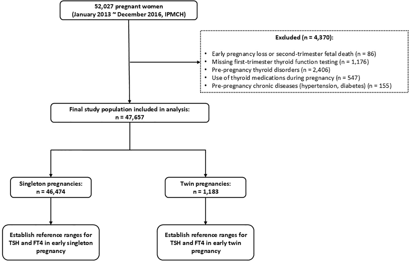 This retrospective cohort study included data from women with singleton and twin pregnancies who received prenatal care at the International Peace Maternity and Child Health Hospital (IPMCH), a tertiary specialized hospital in Shanghai, between January 2013 and December 2016. A total of 52,027 pregnant women were initially enrolled. After excluding 86 cases of early miscarriage or mid-trimester fetal loss, 1,176 cases without thyroid function testing in early pregnancy, 2,406 women with pre-existing thyroid disorders, 547 women who used thyroid medications during pregnancy, and 155 women with pre-existing chronic conditions (hypertension or diabetes), a final cohort of 47,657 women was included. Among them, 46,474 had singleton pregnancies and 1,183 had twin pregnancies. The detailed inclusion and exclusion process is shown in Figure 1.