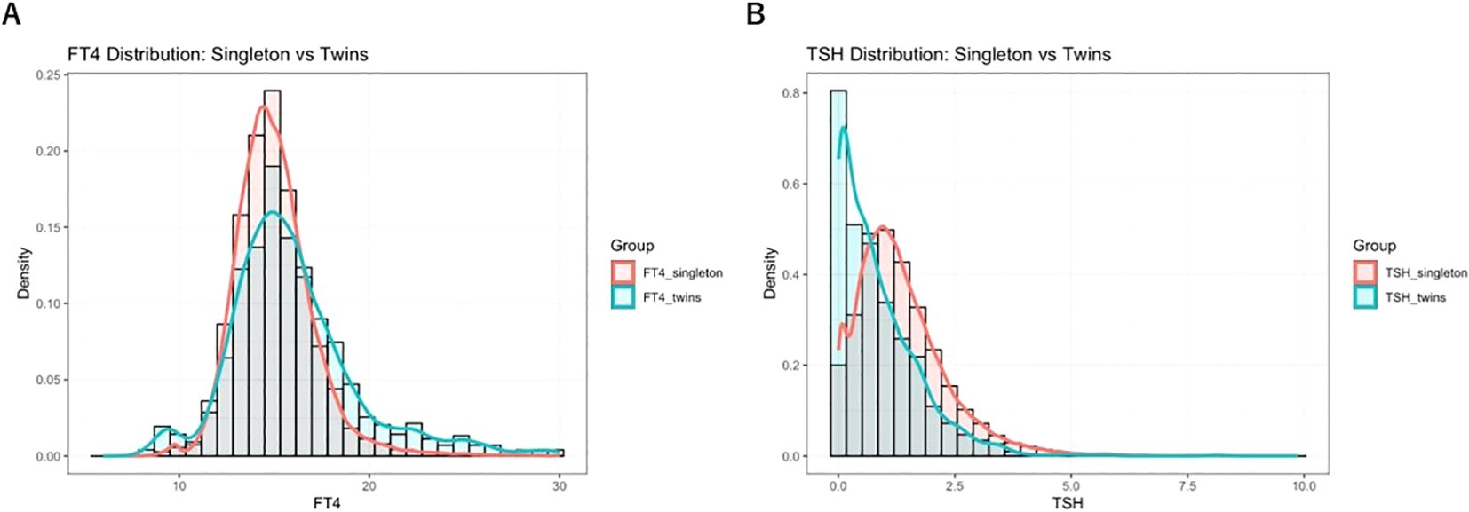 Figure 2. Distribution of TSH and FT4 levels in twin pregnancies during early pregnancy and comparison with singleton pregnancy reference intervals: Panel (A) shows the distribution of FT4 levels; Panel (B) shows TSH levels. The figure illustrates the distribution of early pregnancy TSH and FT4 in 1,183 twin pregnancies and 46,474 singleton pregnancies, presented as density curves and histograms. The green shaded area represents the locally established 95% reference interval (P2.5–P97.5) for twin pregnancies, while the red shaded area indicates the corresponding reference interval for singleton pregnancies. Notable differences in the distributions of TSH and FT4 levels were observed between twin and singleton pregnancies, highlighting the distinct thyroid function profiles associated with multiple gestations.