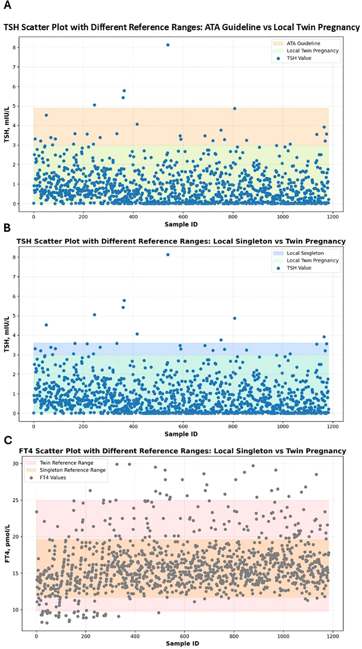 Figure 3. Scatter plots of serum TSH and FT4 levels in twin pregnancies according to different reference intervals. Panel (A) shows TSH scatter plot with different reference ranges: ATA guideline vs local twin pregnancy. Panel (B) shows TSH scatter plot with different reference ranges: local singleton vs twin pregnancy. Panel (C) shows FT4 scatter plot with different reference ranges: local singleton vs twin pregnancy. Scatter plots show the distribution of serum TSH and FT4 levels according to three diagnostic standards: the ATA guideline, local singleton-based reference ranges, and locally established twin-specific reference ranges. Colored shaded bands represent the normal reference ranges defined by different diagnostic standards. Each dot represents an individual measurement; deep blue dots denote TSH values, while dark gray dots denote FT4 values.