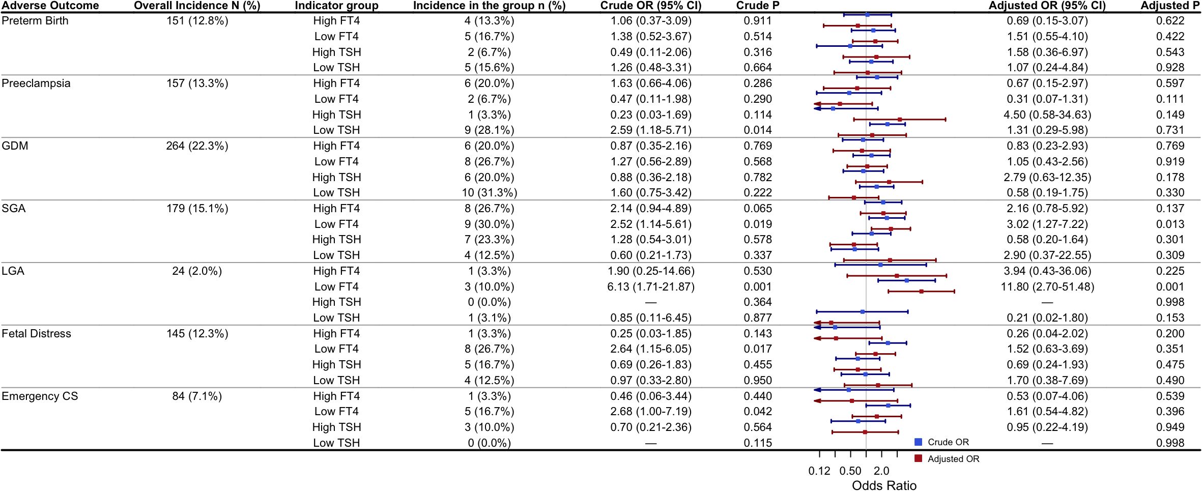 Figure 4. Univariate and multivariate logistic regression analyses of the association between abnormal FT4/TSH and adverse pregnancy outcomes: Adjusted ORs were obtained from multivariable logistic regression models adjusting for maternal age, pre-pregnancy BMI, education level, TPOAb status, and use of IVF. High or low FT4/TSH were defined as >97.5th or <2.5th percentile based on cohort-specific reference ranges for twin pregnancies. The reference group for the regression analyses was participants with FT4 and TSH levels within the normal range. P-values < 0.05 were considered statistically significant. Abbreviations: GDM, Gestational diabetes mellitus; SGA, Small for gestational age; LGA, Large for gestational age; IVF, in vitro fertilization; CS, Cesarean section.