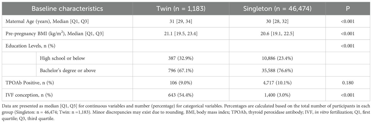 Based on the inclusion and exclusion criteria of this study, a total of 47,657 pregnant women were enrolled, including 1,183 singleton pregnancies and 46,474 twin pregnancies. The baseline characteristics of the two groups are presented in Table 1. Given the retrospective observational design, statistical comparisons for baseline characteristics were performed using the Chi-square test for categorical variables and the Mann-Whitney U test for continuous variables, and P values are provided to indicate potential differences between singleton and twin pregnancies. As shown in Table 1, maternal age, pre-pregnancy BMI, education level, and IVF conception differed significantly between the two group. Therefore, these variables were adjusted as confounders in the subsequent multivariate analyses.