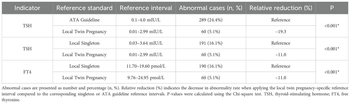 For many years, it has been recognized that thyroid function during pregnancy is critical to maternal and fetal health. Maternal thyroid hormones may influence placental development, and the transfer of maternal T4 across the placenta can affect normal fetal development (11). Studies have linked thyroid dysfunction to risks such as preterm birth, miscarriage, and impaired fetal neurodevelopment. Therefore, some experts advocate for treatment in these cases. However, the risks of overtreatment have also been documented. Unnecessary therapy, particularly thyroid hormone supplementation, can expose both mother and fetus to potential side effects (2). Insufficient or excessive treatment of thyroid disorders, inappropriate choice of therapeutic regimen, or delays in initiating or adjusting treatment may all adversely affect pregnancy and fetal outcomes (11). For instance, research shows a U-shaped relationship between maternal FT4 levels and child IQ, gray matter volume, and cortical brain volume, with high FT4 also associated with increased incidence of attention deficit hyperactivity disorder (ADHD) and behavioral problems (12, 13). Reported prevalence of thyroid disorders during pregnancy varies across studies, largely due to differences in reference ranges used (14). Physiological changes in thyroid function and hormone metabolism during pregnancy have led many researchers to recommend pregnancy- and population-specific TSH and thyroid hormone reference intervals. Factors such as BMI, iodine intake, ethnicity, and presence of anti-thyroid antibodies may influence reference values (14, 15). Consequently, unified reference ranges recommended by endocrine societies may misclassify healthy pregnant women as abnormal (16). Accurate diagnosis requires reliable, individualized reference intervals (17). Although scientific associations are developing population-specific thyroid function reference ranges (17, 18), twin pregnancies are often excluded due to their unique physiological differences (19), including higher hCG and estrogen levels (20). In early twin pregnancies, FT4 is elevated due to hCG stimulation (3), with both total and free β-hCG peaking significantly higher and lasting longer between 8 and 16 weeks gestation. Serum hCG increases by 10,000 U/L typically lower serum TSH by 0.1 mU/L, reflecting the inverse relationship throughout pregnancy, which may cause more pronounced physiological TSH suppression in twin pregnancies (21). Moreover, increased metabolic demands in twin pregnancies raise the risk of various nutritional deficiencies that can affect thyroid hormone secretion (22). Previous attempts to establish twin-specific reference ranges have been limited by varying assay methods, making direct comparison difficult (23). Our study found that early-pregnancy TSH median and reference range were significantly lower in twins compared to singletons, while FT4 median and reference range were significantly higher. These findings reflect the unique thyroid function regulation in twin pregnancies. Using singleton or guideline reference ranges directly may lead to misclassification of thyroid dysfunction, underscoring the importance of twin-specific reference intervals. When compared with universal standards, applying ATA guidelines or singleton reference ranges in early pregnancy significantly overestimated the prevalence of thyroid dysfunction in twin pregnancies. Using twin-specific reference intervals brought detection rates closer to those of singletons. This emphasizes the need for dedicated twin pregnancy reference ranges to avoid unnecessary clinical intervention. While twin pregnancies have been thought to carry a higher risk of thyroid dysfunction, our findings suggest this difference may mainly stem from the inappropriate use of singleton reference intervals, leading to overdiagnosis and potentially unnecessary treatments, wasted healthcare resources, and increased psychological burden on pregnant women.