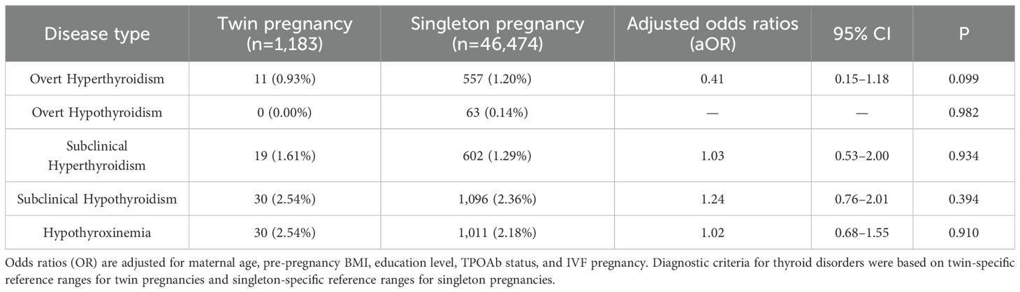 We also applied thyroid function reference ranges specific to twin and singleton pregnancies to compare the incidence of various thyroid disorders between the two groups. The results showed no significant differences in the prevalence of any thyroid dysfunction between women with twin pregnancies and those with singleton pregnancies (Table 3). Specifically, the incidence of overt hyperthyroidism was slightly lower in the twin pregnancy group compared to the singleton group (0.93% vs. 1.20%), with no statistically significant difference (aOR = 0.41, 95% CI 0.15–1.18, P = 0.099). Overt hypothyroidism was not observed in the twin group (0%), while it was 0.14% in the singleton group (P = 0.982). The incidences of subclinical hyperthyroidism (1.61% vs. 1.29%, aOR = 1.03, 95% CI 0.53–2.00, P = 0.934), subclinical hypothyroidism (2.54% vs. 2.36%, aOR = 1.24, 95% CI 0.76–2.01, P = 0.394), and hypothyroxinemia (2.54% vs. 2.18%, aOR = 1.02, 95% CI 0.68–1.55, P = 0.910) were slightly higher in the twin group, but none of these differences reached statistical significance.