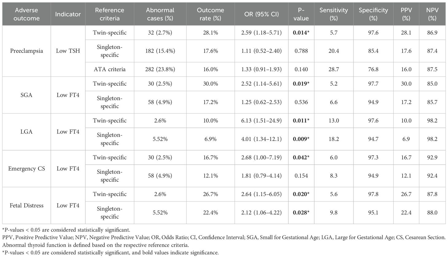 In this study, three different thyroid function reference ranges were applied to assess abnormalities in TSH and FT4 levels during the first trimester in women with twin pregnancies: a twin pregnancy-specific reference range, a singleton pregnancy-specific reference range, and the ATA-recommended reference range. Based on each reference standard, we identified cases of high or low TSH/FT4 and evaluated their associations with adverse pregnancy outcomes, including preterm birth, preeclampsia, GDM, SGA, LGA, fetal distress, and emergency cesarean section. We used univariate logistic regression models to calculate the proportion of abnormal thyroid function, the incidence of each adverse outcome, the ORs and corresponding 95% CI under each reference standard. In addition, the sensitivity, specificity, positive predictive value (PPV), and negative predictive value (NPV) of each reference range were evaluated. A P-value < 0.05 was considered statistically significant. Our results showed that, in predicting pregnancy complications, low TSH defined by the twin-specific reference range was significantly associated with preeclampsia (OR = 2.59, 95% CI: 1.18–5.71, P = 0.014). Under the similar NPV, this reference showed a higher specificity (97.6%) and a higher PPV (28.1%) compared to the other standards. both superior to the singleton-specific and ATA reference ranges. In contrast, low TSH defined by the singleton-specific and ATA standards was not significantly associated with preeclampsia (P = 0.788 and 0.140, respectively). In terms of fetal outcomes, low FT4 defined by the twin-specific range was significantly associated with SGA (OR = 2.52, 95% CI: 1.14–5.61, P = 0.019), LGA (OR = 6.13, 95% CI: 1.51–24.9, P = 0.011), emergency cesarean section (OR = 2.68, 95% CI: 1.00–7.19, P = 0.042), and fetal distress (OR = 2.64, 95% CI: 1.15–6.05, P = 0.020). These associations were accompanied by consistently high specificity and relatively high PPV, while maintaining comparable NPV. By comparison, under the singleton-specific standard, only the associations with LGA and fetal distress reached statistical significance, and both specificity and PPV were slightly lower. Detailed results are shown in Table 4. In summary, the twin-specific reference range demonstrated superior accuracy in identifying truly abnormal and high-risk cases among women with twin pregnancies. It significantly reduced misclassification and overdiagnosis while maintaining high confidence in negative results.