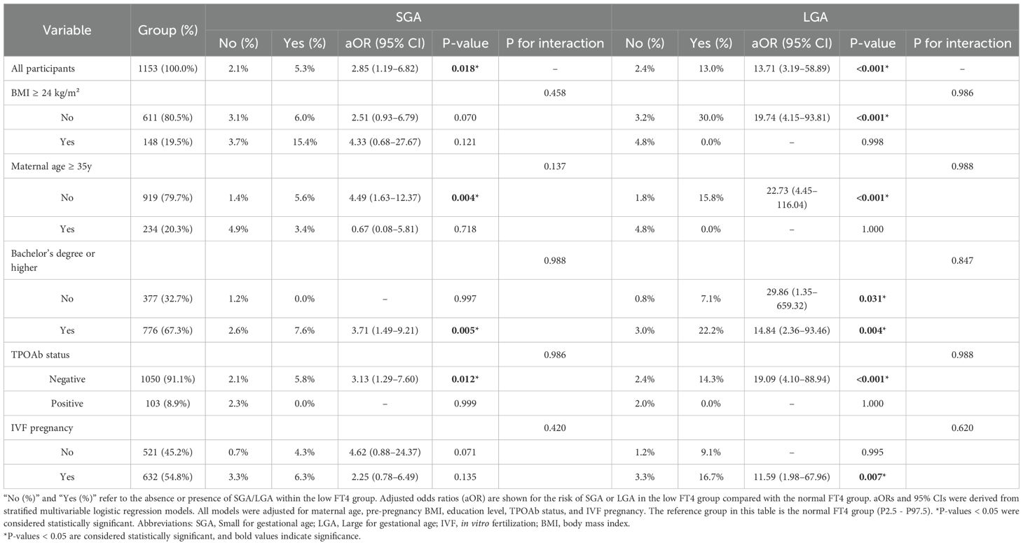 To explore whether the association between low FT4 and the risks of SGA and LGA varies by maternal characteristics, stratified and interaction analyses were conducted. The results showed no statistically significant interactions between FT4 levels and all tested maternal variables, including pre-pregnancy BMI, maternal age, educational level, TPOAb status, and IVF use (Table 5). This suggests that the effect of low FT4 on the risks of SGA and LGA may be relatively consistent across the study population, with no evident heterogeneity observed. However, the limited number of events in some subgroups, particularly in the LGA analysis, may have reduced the statistical power to detect interactions, highlighting the need for further studies with larger sample sizes.
