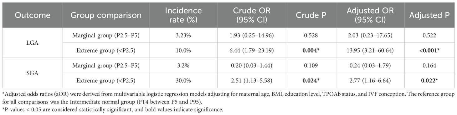 The incidence rates of LGA were 10.0%, 3.23%, and 1.7% across the extreme group, marginal group, and intermediate normal group, respectively. After multivariate adjustment, the extreme group had a significantly increased risk of LGA (aOR = 13.95, 95% CI: 3.21–60.64, P < 0.001); although the marginal group showed an elevated trend (aOR = 2.03), it was not statistically significant (P = 0.522). Similarly, the incidence rates of SGA were 30.0%, 3.2%, and 14.6% across the three groups, respectively. Multivariate analysis demonstrated a significantly increased risk of SGA in the extreme group (aOR = 2.77, 95% CI: 1.16–6.64, P = 0.022); the marginal group, however, showed a non-significant downward trend (aOR = 0.24, 95% CI: 0.03–1.79, P = 0.164). These findings further support the scientific and clinical validity of using P2.5 as the lower limit of FT4 abnormality, as this threshold effectively identifies high-risk pregnant women with adverse outcomes. The marginal range (P2.5–P5) did not show a significant risk in this study, suggesting no current need to adjust the existing reference interval. The current reference range demonstrates good risk identification capability in clinical practice.