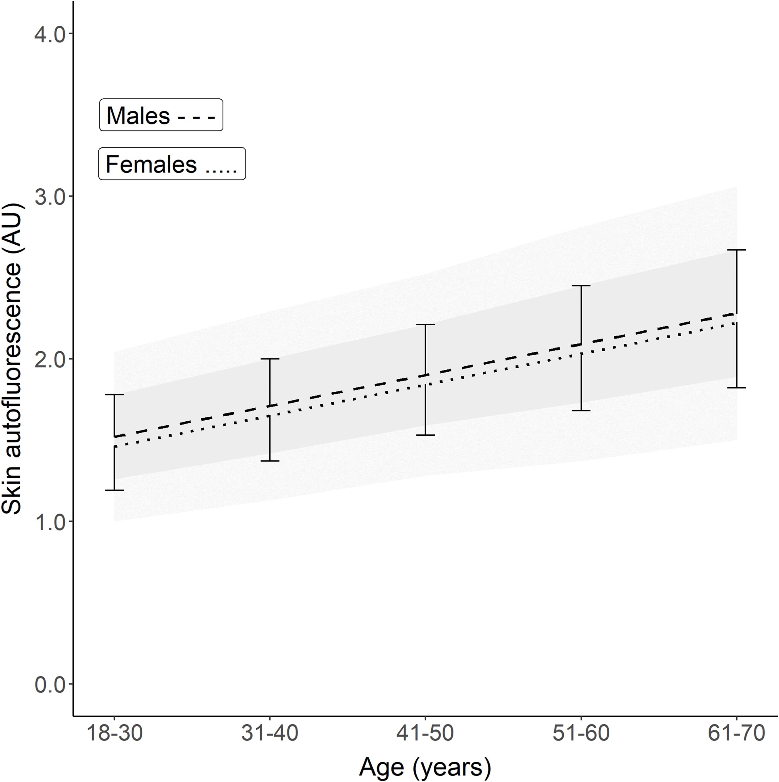 Line graph showing skin autofluorescence in arbitrary units (AU) across age groups for males and females. Both genders show an upward trend from 1.6 AU at 18-30 years to around 2.5 AU at 61-70 years. Males are represented by a dashed line, females by a dotted line, with overlapping error bars.