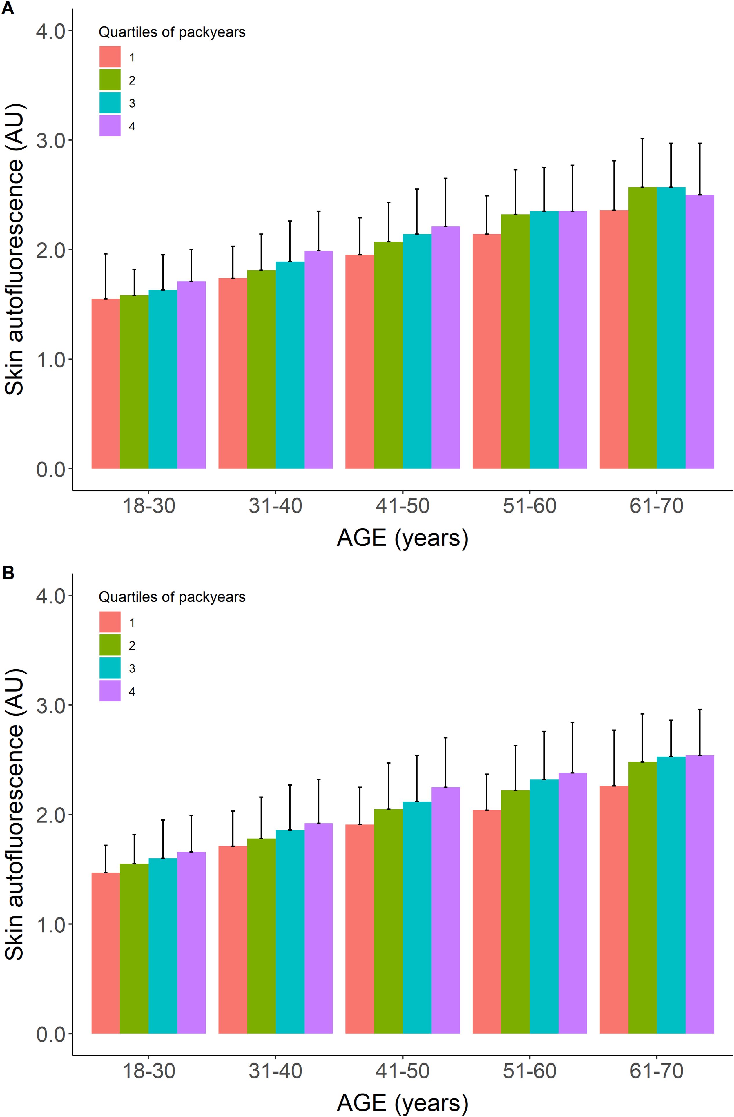 Bar charts labeled A and B show skin autofluorescence in arbitrary units across different age groups, 18-30 to 61-70 years, divided into packyear quartiles. Both charts indicate an increase in autofluorescence with age.