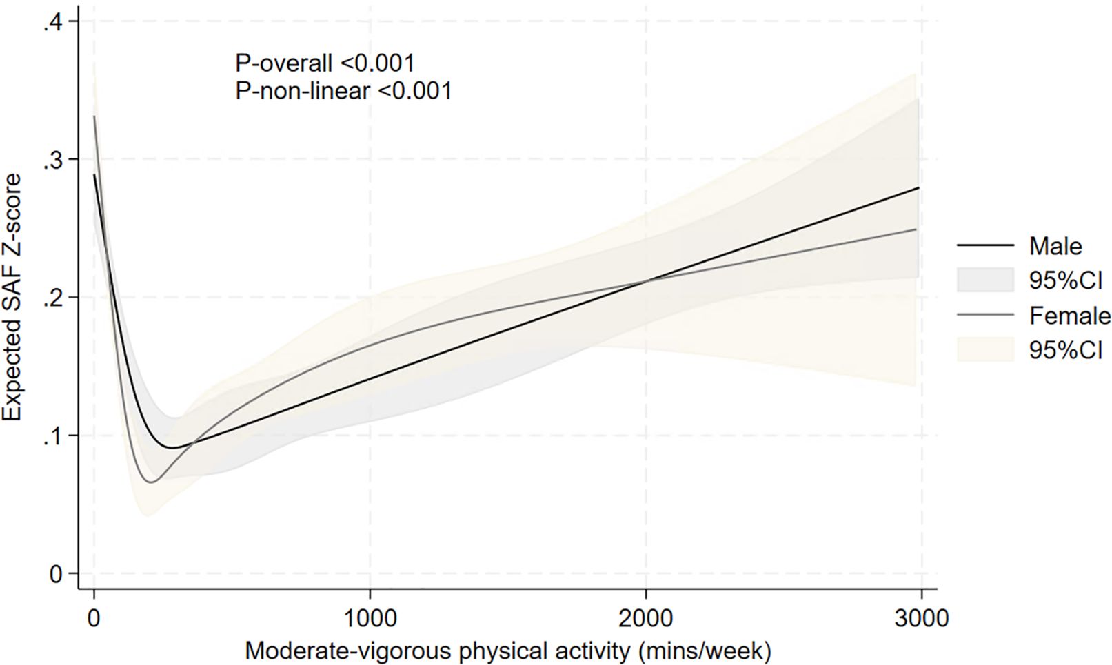 Figure 8. Relationship between moderate-to-vigorous intensity physical activity and expected age- and sex-adjusted SAF scores, evaluated using restricted cubic splines. The results are presented using solid black and grey lines for the expected SAF Z-score in men and women, respectively, and grey and light-brown shadow (indicating the 95% confidence interval) for the respective confidence intervals. p-values for non-linearity and overall association are also presented.