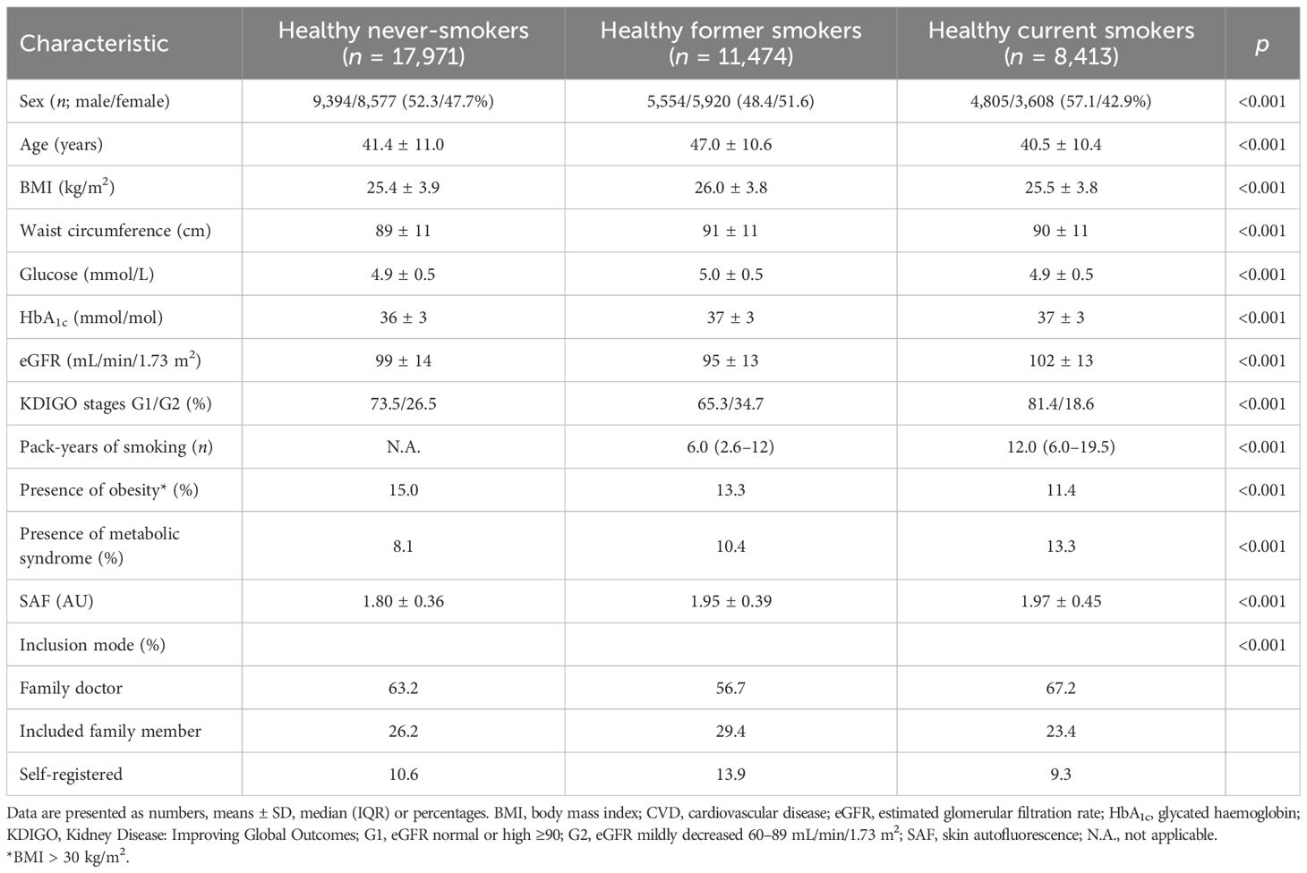 A total of 82,870 participants had a valid SAF measurement at the baseline Lifelines screening. Table 1 shows the characteristics of the healthy participants according to their baseline smoking status. In never-smokers, the mean ( ± SD) age was 41.4 ± 11.0 years, and BMI was 25.4 ± 3.9 kg/m2. By definition, they had normal concentrations of fasting glucose and HbA1c and normal eGFR, while 8.1% fulfilled the criteria for metabolic syndrome.
