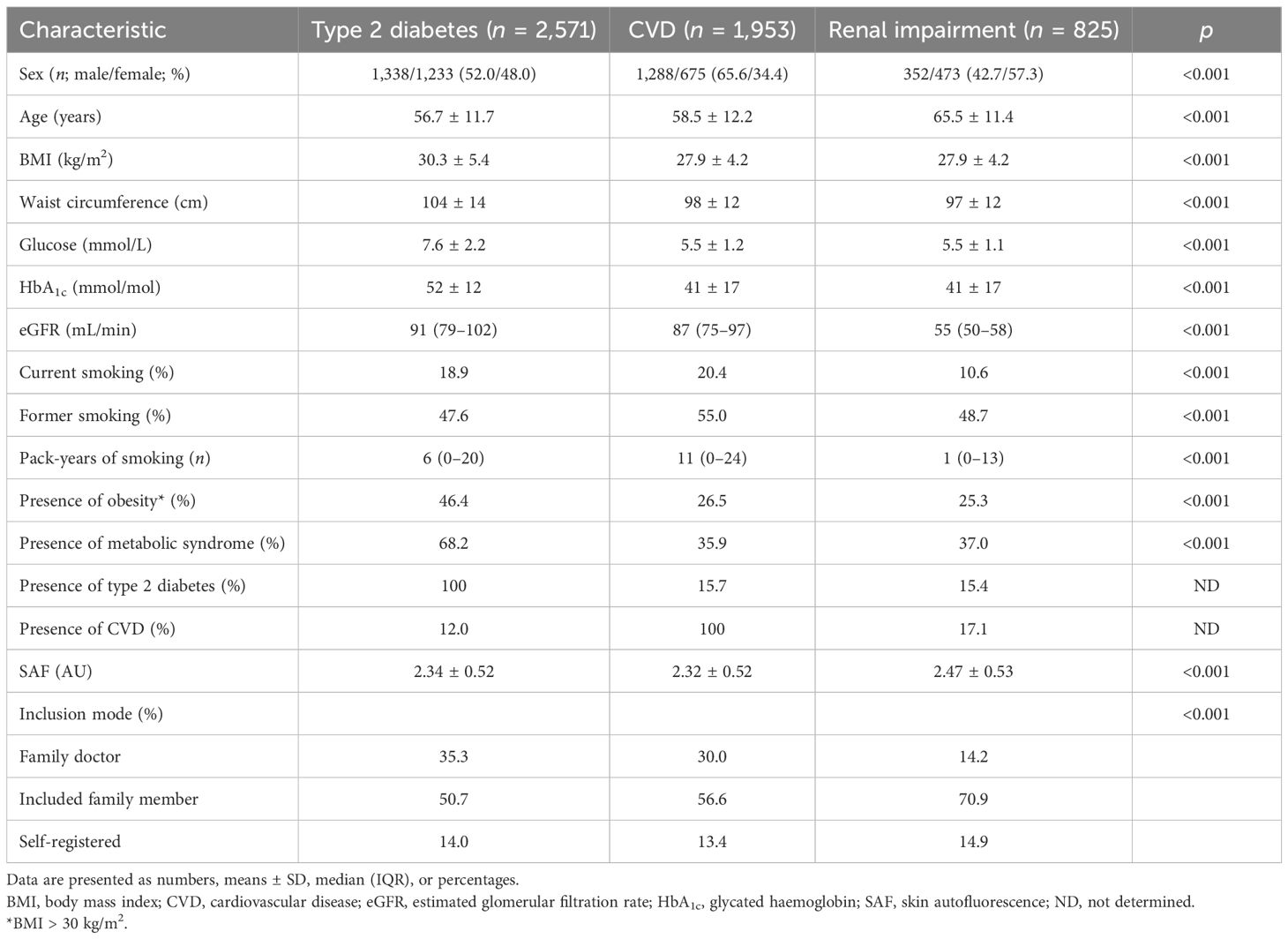 Table 3 shows a brief overview of the baseline characteristics of the participants with type 2 diabetes, CVD, and renal impairment. Their mean age was considerably higher than that of healthy participants, with higher BMI and glycaemic variables in the participants with type 2 diabetes and a high percentage (60%–75%) of combined former and current smoking. In Figure 4, we show the mean SAF values for individuals with type 2 diabetes, those with CVD, and those with reduced eGFR, separately by sex. For almost each decade, both people with type 2 diabetes, CVD, and renal impairment have significantly higher SAF values compared to healthy individuals.