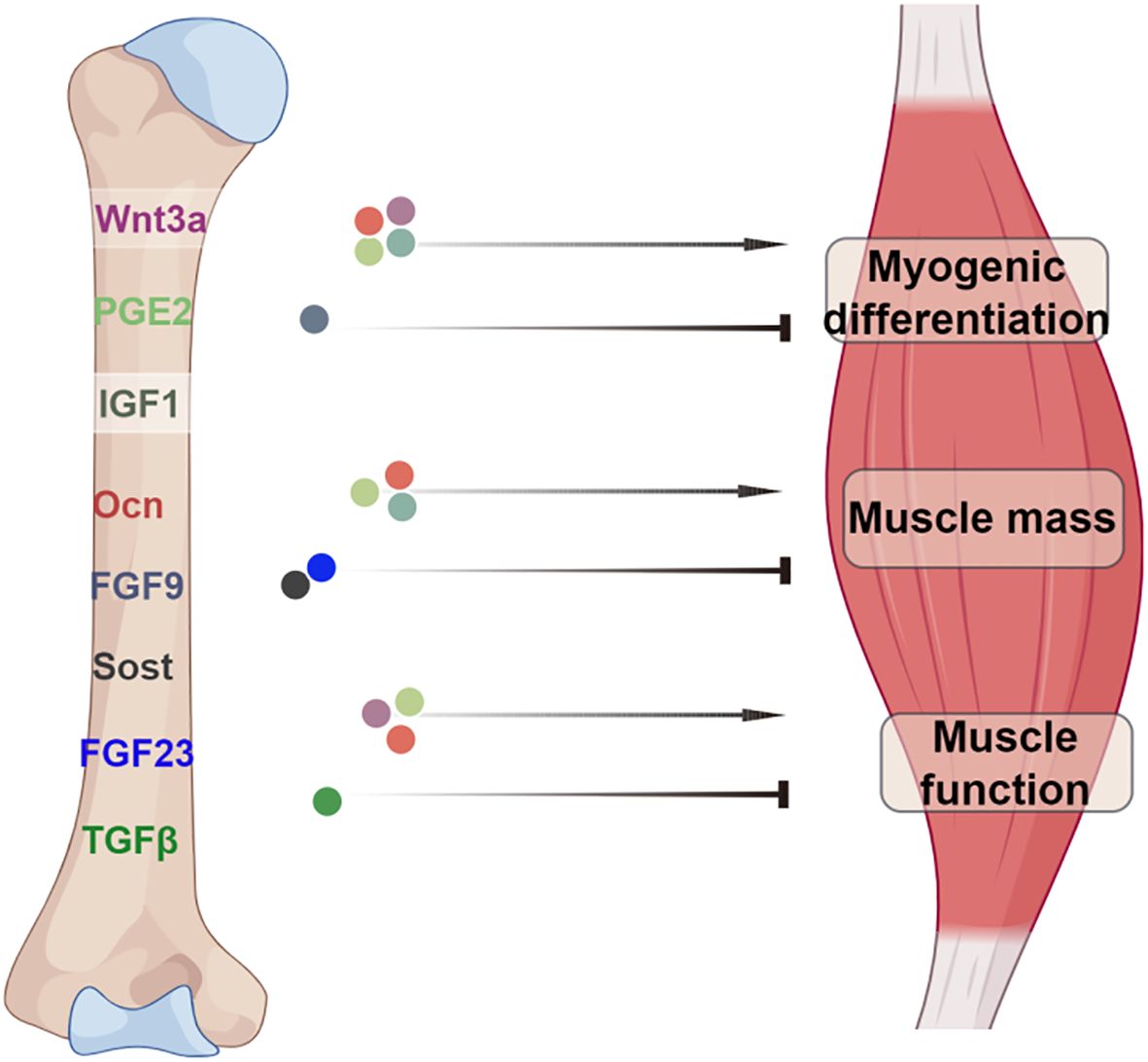 Osteoporosis and sarcopenia, which are characterized by the deterioration of bone strength and muscle function, respectively, are frequently regarded as inevitable consequences of the aging process. These conditions have emerged as significant public health concerns, affecting over 1.7 billion people worldwide (1). Bone loss is often concomitant with a decline in muscle mass and function, suggesting that osteoporosis and sarcopenia develop in tandem, thereby increasing the risk of bone fractures. Bone and skeletal muscle, two major components of the musculoskeletal system, are intimately and mechanically connected. Bone serves as an attachment site for skeletal muscle, while muscle exerts force on the bone to facilitate movement (2). This mechanical linkage is essential not only for normal development and locomotion but also plays a pivotal role in the alterations of both tissues resulting from disease and aging (3). Furthermore, a growing body of evidence supports the notion that bone and muscle function as endocrine organs, affecting various other tissues and organs, including the liver, adipose tissue, kidneys, and pancreas [reviewed by Karsenty and Olson (4)]. Given the intricate relationship between bone and muscle, it is posited that the development and maintenance of these two tissues are governed by a variety of biochemical factors beyond mechanical. Currently, the growing identification of novel “myokines” has redirected attention toward the role of muscle in this interrelationship (5–7); however, the contributions of bone-derived factors and their effects on skeletal muscle should not be ignored. In this context, we aim to summarize recent findings concerning the role of bone-derived factors in the regulation of skeletal muscle function. Research on the crosstalk between bone and muscle presents a significant opportunity for identifying potential therapeutic targets for the dual conditions of osteoporosis and sarcopenia.
