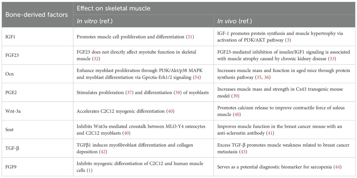 Bone serves as a key reservoir for mineral and matrix proteins and regulates skeletal muscle through the release of bone-derived factors into the bloodstream. Several of these factors include osteocalcin, FGF23, IGF1, sclerostin, PGE2, FGF9, Wnt3a, and TGF-β. We will discuss their effects on skeletal muscle, as detailed below (Table 1).
