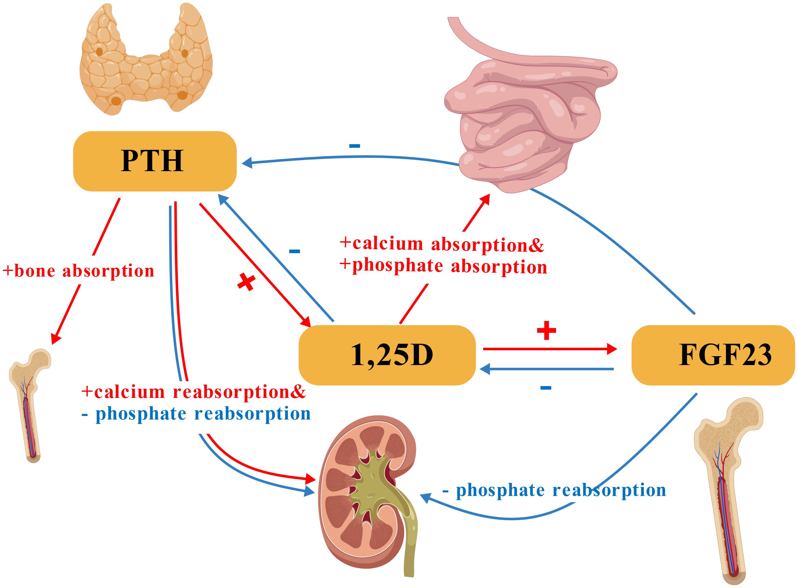 Figure 1. Core regulatory interactions of PTH, 1,25-dihydroxyvitamin D (1,25D), and FGF23 in calcium-phosphate homeostasis. PTH stimulates bone resorption and renal calcium reabsorption while promoting phosphaturia. 1,25D enhances intestinal calcium and phosphate absorption. FGF23 primarily promotes renal phosphate excretion. PTH, Parathyroid Hormone; 1,25D, 1,25-Dihydroxyvitamin D; FGF23, Fibroblast Growth Factor 23. Symbol and Arrow Definitions: “+”= Stimulation/promotion of the process;”-”: Inhibition/suppression of the process. Red arrows: Indicate stimulatory interactions. Blue arrows: Indicate inhibitory interactions.(Created with BioGDP.com).