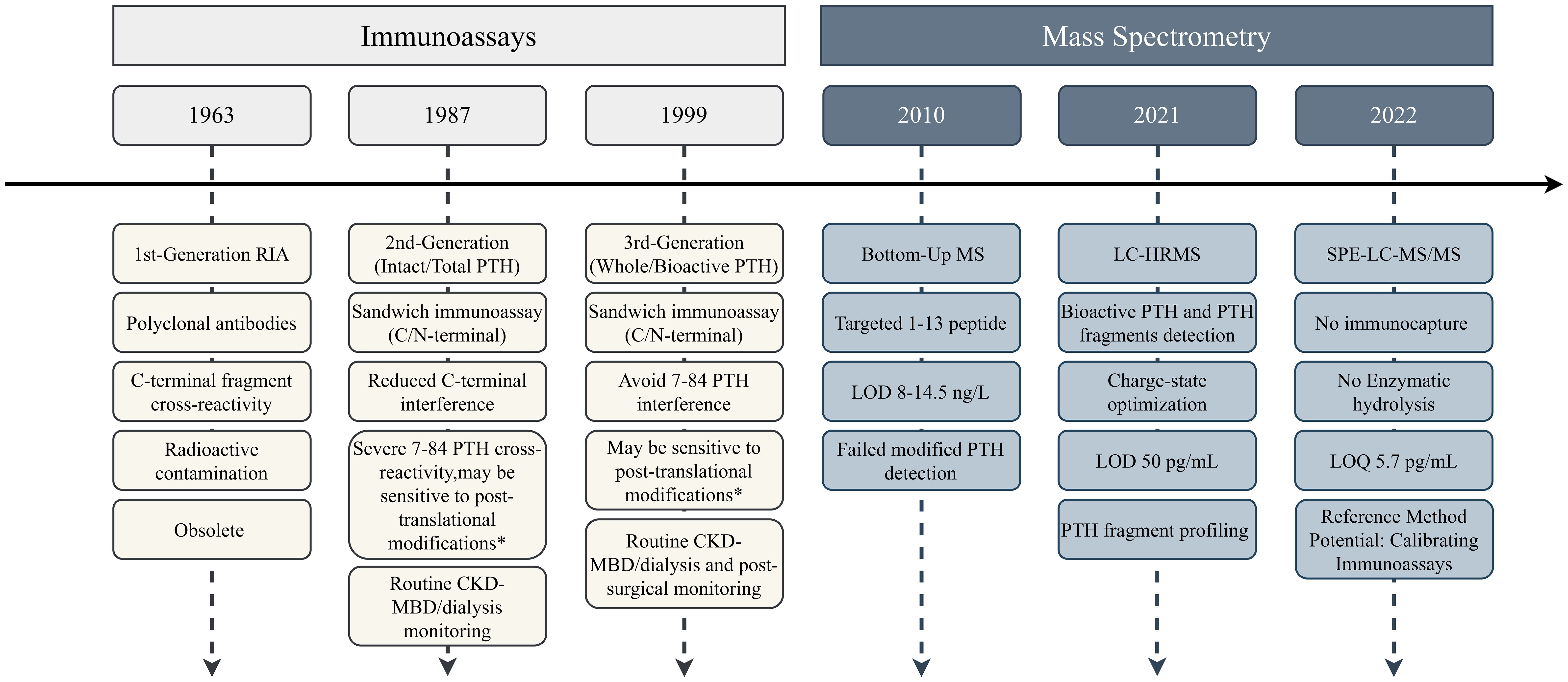 The evolution of PTH detection methods spans over five decades, with significant advancements in sensitivity, specificity, and clinical applicability (35). The chronological progression of PTH detection methodologies is summarized in Figure 2.