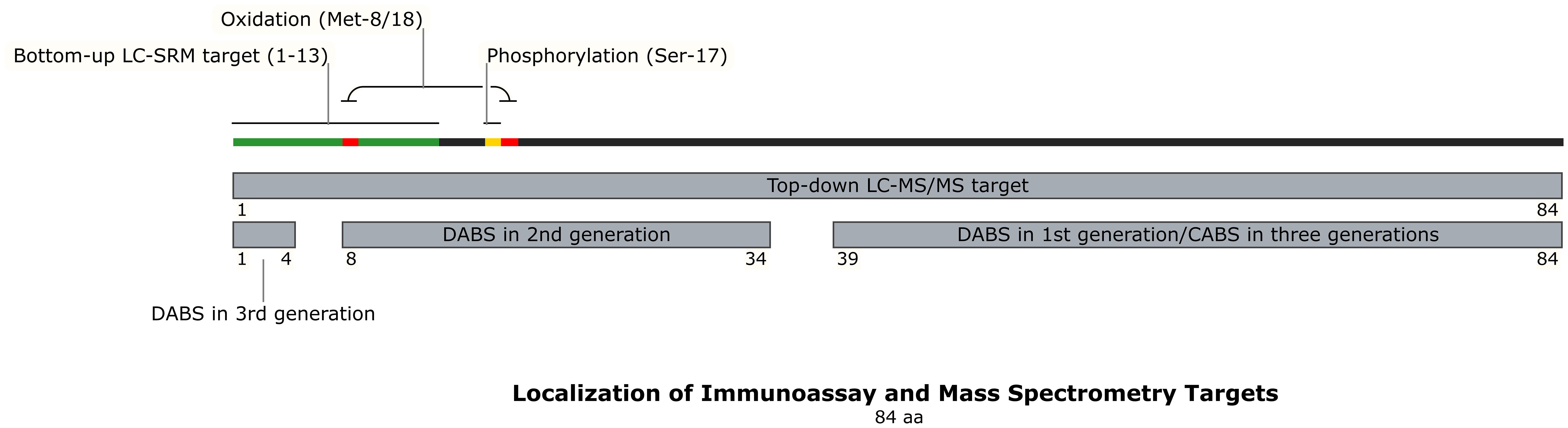 Figure 3. Localization of Immunoassay and Mass Spectrometry Targets. This schematic maps the binding regions of detection and capture antibodies used in different generations of PTH immunoassays (1st, 2nd, and 3rd gen) onto the 84-amino acid PTH structure. It also illustrates the target regions for bottom-up and top-down mass spectrometry analysis, and highlights key sites of post-translational modification (oxidation at Met8/18, phosphorylation at Ser17). The distinct molecular targets of each method explain why different assays yield non-comparable PTH results, especially in CKD where PTH fragment composition is altered. DABS, detection antibody binding site; CABS, capture antibody binding site; AA, amino acid.