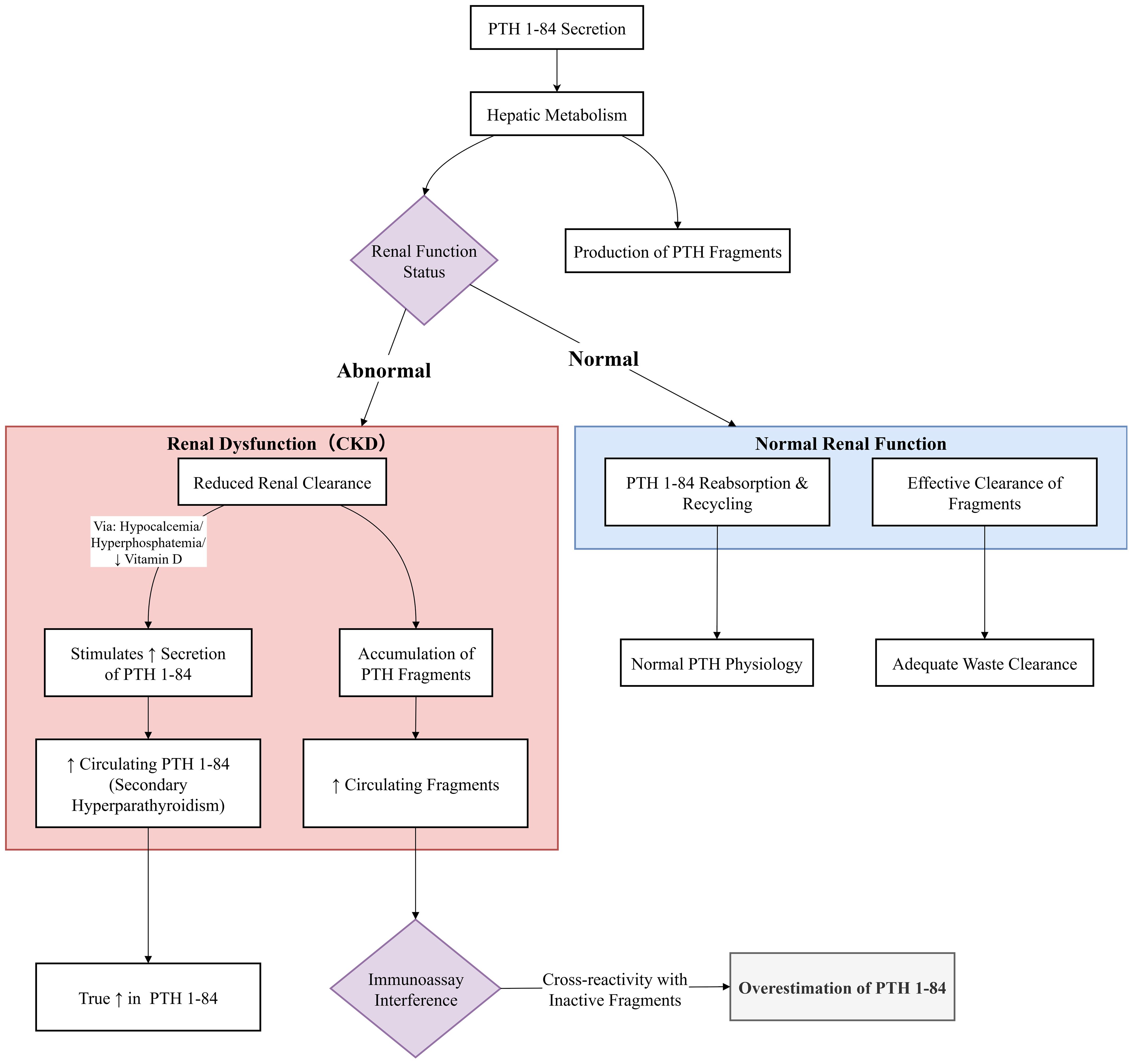 PTH heterogeneity refers to the coexistence of multiple molecular variants with structural and/or length differences in a single sample. These variants arise from alternative splicing, post-translational modifications, enzymatic processing, or degradation (21). The metabolic fate and clinical detection of these variants are largely influenced by renal function, as illustrated in Figure 4. As previously discussed, the discovery of PTH fragments and modified forms has driven immunoassay evolution. However, the full spectrum of circulating PTH variants remains incompletely characterized, with significant gaps in understanding their clinical relevance.