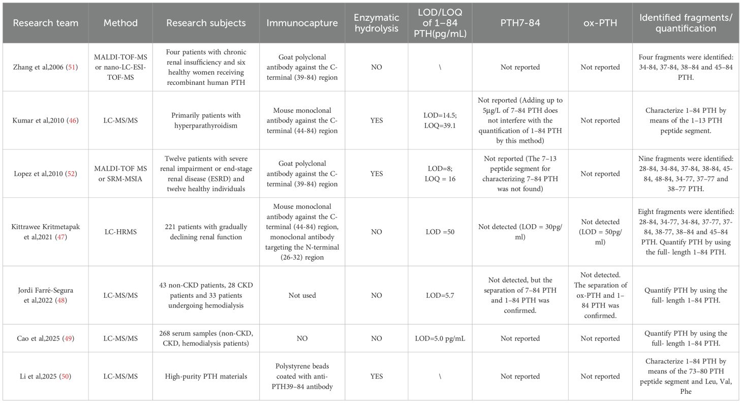 The types and amounts of PTH fragments present in the human body have long been a focus of interest among researchers. Complementing these advances in the quantification of intact 1–84 PTH, MS has revealed the complex landscape of PTH fragments. Zhang et al. (51) (2006) first identified CKD-specific C-terminal fragments (34-84, 37-84, 38-84, 45-84) using capillary LC-MALDI-TOF/MS, while Lopez et al. (52) (2010) subsequently discovered novel truncations (28-84, 48-84, 34-77, 37-77, 38-77) through SRM-based immunoassays, quantifying key variants at detection limits of 8–22 pg/mL. In 2021, Kritmetapak et al. (47), established a high-resolution MS method for measuring PTH and its fragments. This approach allows for the simultaneous measurement of 1–84 PTH and various PTH fragments, providing a more comprehensive view of PTH metabolism, and has identified types of PTH fragments similar to those in the study by Lopez et al. Table 2 summarizes the advances in PTH-related MS methods.