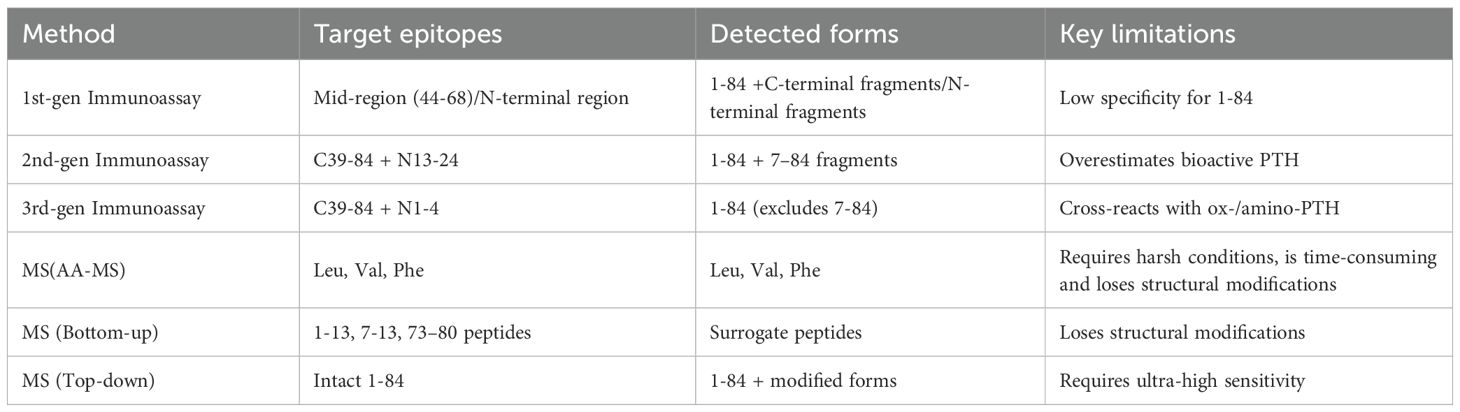 Several studies have focused on developing liquid chromatography-tandem mass spectrometry (LC-MS/MS) methods for the quantification of intact 1–84 PTH. In 2009 Kumar et al. (46) introduced immunocapture-MS methods targeting the N-terminal 1–13 peptide (SVSEIQLMHNLGK) as a surrogate for 1–84 PTH with a limit of quantification (LOQ) at 39.1 pg/mL. Then Kritmetapak et al. (47) (2021) pioneered a dual-epitope immunocapture LC-HRMS method that directly measures 1–84 PTH without enzymatic digestion, achieving a linear range of 39.1–4,560 pg/mL with a LOQ at 50 pg/mL through DMSO-enhanced ionization. This breakthrough was followed by Farré-Segura et al.’s (2022) SPE-LC-MS/MS platform (48), which established unprecedented analytical performance with a 5.7 pg/mL LOQ and precision below 5.4% CV and met core reference method criteria. Most recently, Cao et al. (2025) (49)reported an LC-MS/MS method coupled with immunocapture for quantifying PTH 1–84 in patients with CKD. Li et al. (2025) (50)developed two complementary ID-MS approaches—amino acid IDMS (AA-IDMS) and peptide IDMS (peptide-IDMS) for accurate purity quantification of high-purity PTH materials. By targeting specific amino acids (Leu, Val, Phe) and a signature peptide (ADVNVLTK), both methods yielded consistent results, offering a promising framework for quantifying bioactive peptides with similar properties in clinical and research settings.