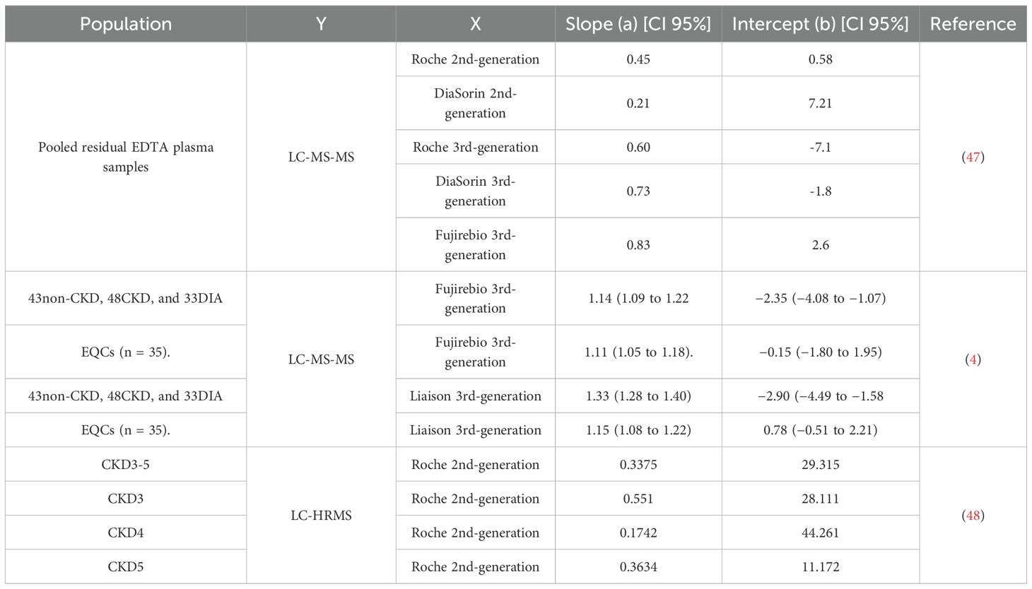 In CKD patients, 2nd-generation immunoassays systematically overestimate bioactive PTH by 30%-50% compared to 3rd-generation methods (84, 87, 88). A 2021 IFCC C-BM meta-analysis of 23 studies reported wide variability in method correlations (slopes: 0.50-2.2), attributed to fragment heterogeneity, evolving calibration standards, and operational differences. Notably, 3rd-generation assays exhibit improved inter-method agreement (slopes: 0.97-1.01) in CKD cohorts, though their clinical superiority remains debated (89, 90). Comparative studies between LC-MS/MS and immunoassays underscore the complexity of PTH detection. LC-MS/MS, which specifically targets the intact 1–84 PTH molecule, consistently reports lower PTH concentrations than immunoassays, yet the results from both methodologies show significant correlations (3, 4) (Table 4). The overestimation by immunoassays may be due to cross-reactivity with a broader spectrum of uncharacterized PTH variants present in CKD patients, and/or the compounding effect of classic immunoassay interferences, such as heterophilic antibodies, biotin, or pre-analytical sample handling artifacts.