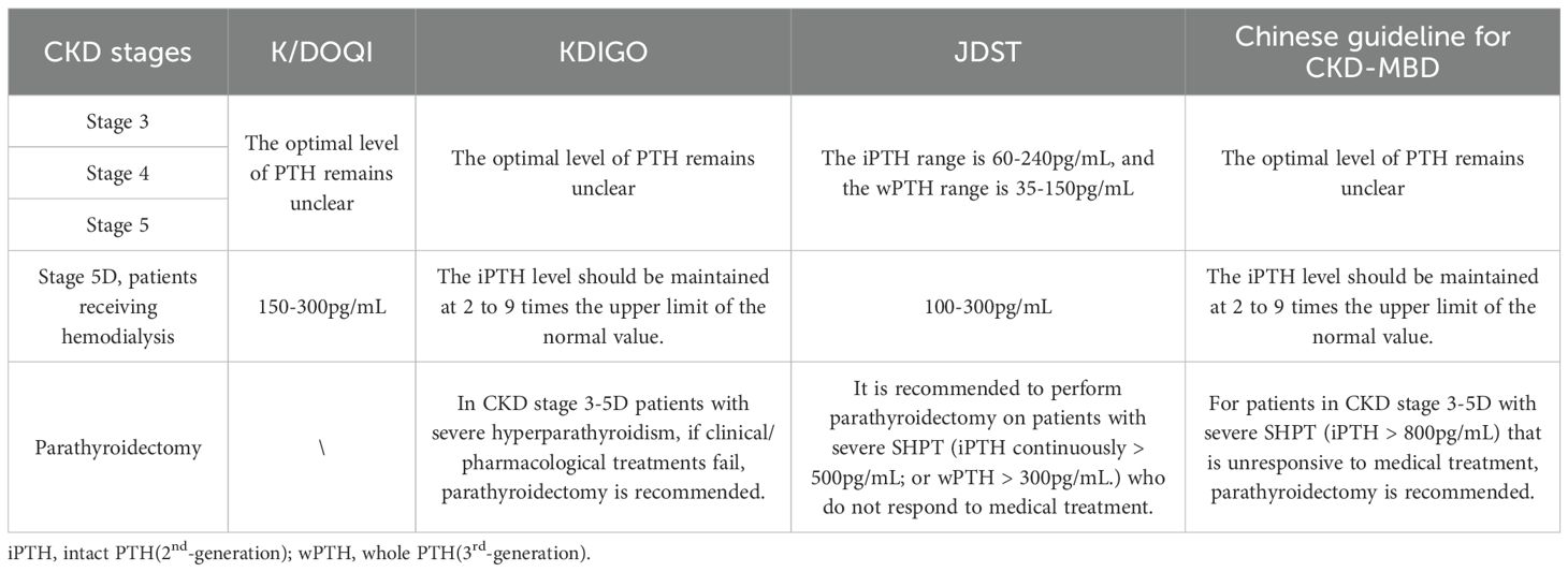 Heterogeneity in CKD-MBD management guidelines reflects methodological limitations and regional epidemiological differences. The Kidney Disease Outcomes Quality Initiative(K/DOQI) framework (2003), based on 2nd-generation assays, recommended PTH targets of 150-300pg/mL to balance bone turnover risks (93). However, calibration drift with modern methods has rendered these thresholds obsolete. Kidney Disease: Improving Global Outcomes (KDIGO) guidelines (2009/2017), incorporating “U-shaped” mortality data, advocate broader targets (2-9× upper normal limits) to mitigate misclassification (94, 95). The Japanese Society for Dialysis Therapy (JSDT) guidelines, informed by survival analyses from its domestic dialysis registry, advocate stricter intact PTH targets (60-240pg/mL). This range correlates with reduced fracture and cardiovascular event rates in Japanese populations, possibly attributed to ethnic variations in the PTH-calcium response curve among Asian populations (96). In contrast, China’s Guidelines for Diagnosis and Management of CKD-MBD adopt the broader KDIGO-recommended range (2–9 times the upper normal limit), reflecting a paucity of high-quality randomized controlled trials (RCTs) in this domain. These guidelines emphasize context-specific adjustments based on regional healthcare resource availability. A comparative summary of international guidelines is provided in Table 5. Standardization remains a critical challenge. Current guidelines prioritize longitudinal trends over single measurements and advocate integrating biochemical markers for comprehensive assessment. Future efforts must focus on harmonized reference materials, method-specific decision thresholds, and multicenter RCTs to define optimal PTH targets across CKD stages. High-resource regions should accelerate adoption of 3rd-generation and MS-based assays to refine therapeutic precision.