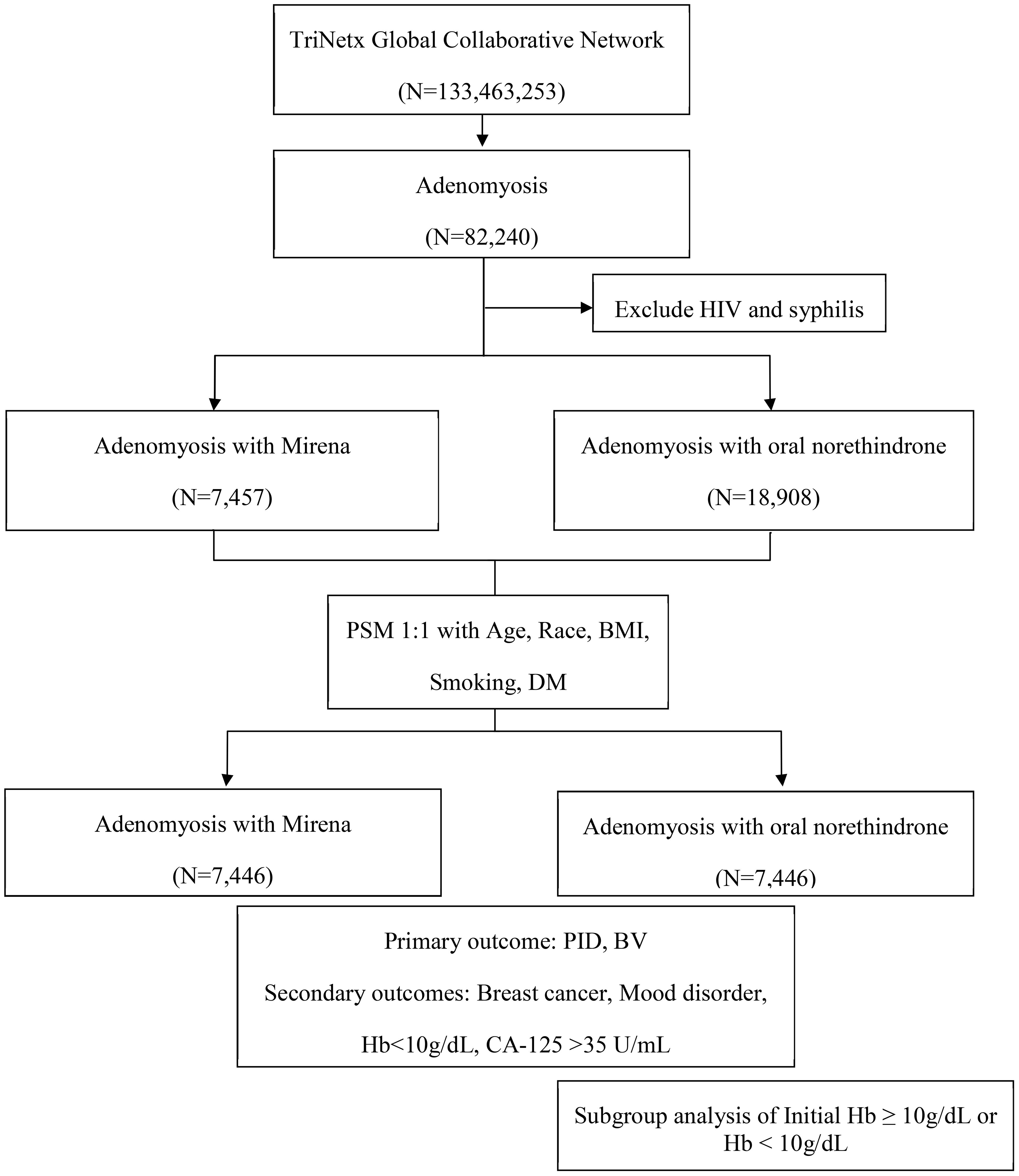 Figure 1. Flowchart of patient selection from the TriNetX research network. BMI, body mass index; BV, bacterial vaginosis; CA-125, cancer antigen 125; DM, diabetes mellitus; Hb, hemoglobin; HIV, human immunodeficiency virus; PID, pelvic inflammatory disease.