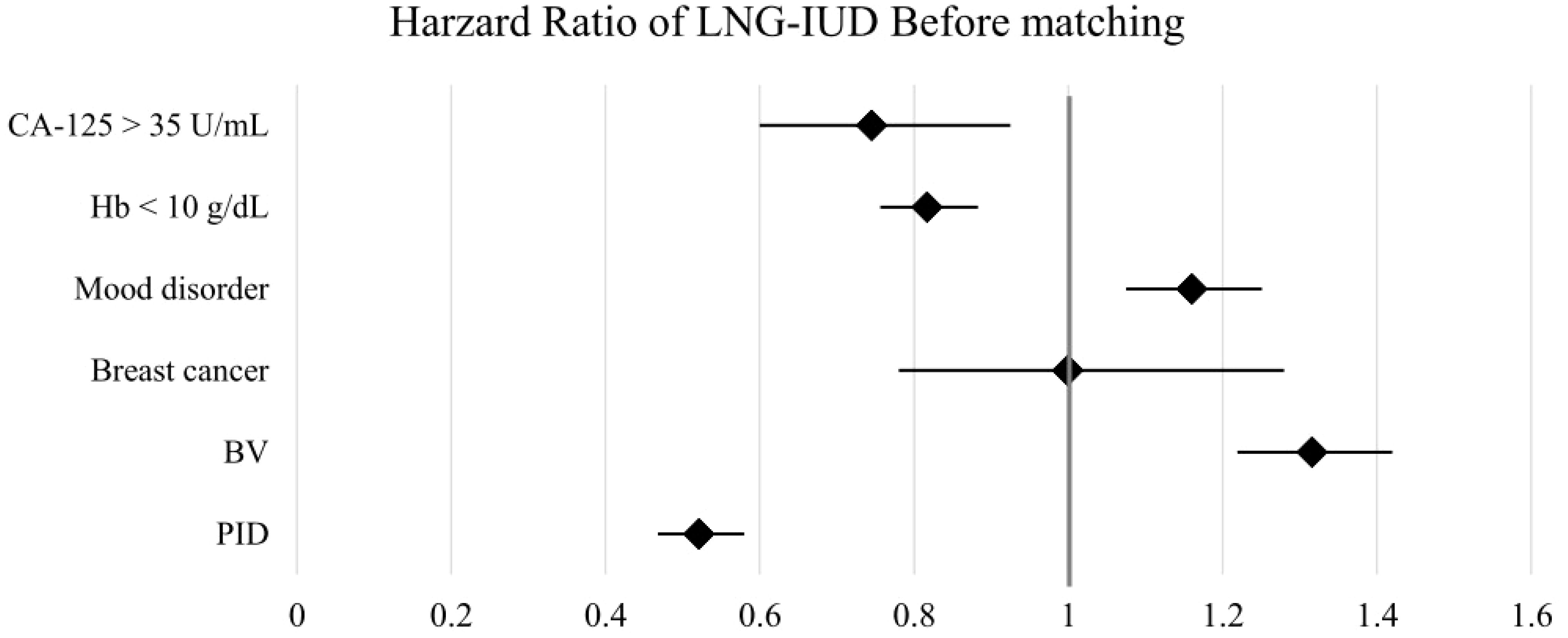 Figure 2. Forest plots of outcomes before matching. BV, bacterial vaginosis; CA-125, cancer antigen 125; Hb, hemoglobin; LNG-IUD, levonorgestrel intrauterine device; PID, pelvic inflammatory disease; PSM, propensity score matching.